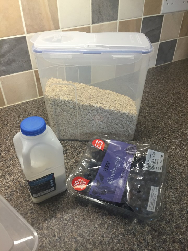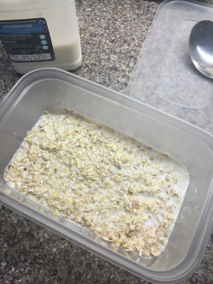 In a microwaveable square container put a tablespoon of milk for each tablespoon of oats until it fills the bottom! Leave the oats to soak up the milk for 2-3mins.