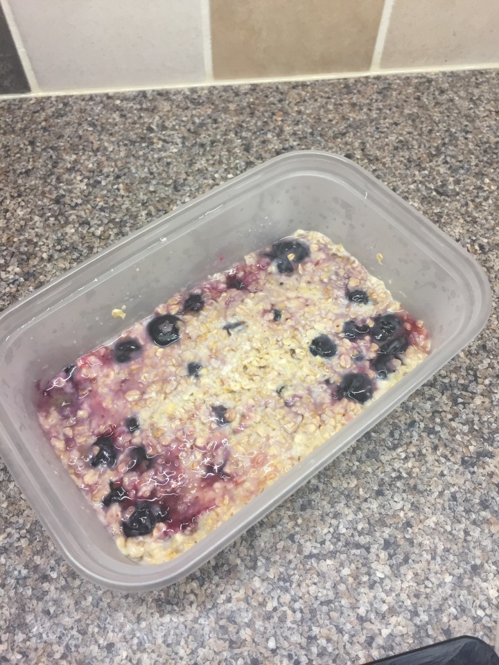 Add a couple of spoons of blueberries and mix in. Pat down and put in the microwave for 90secs