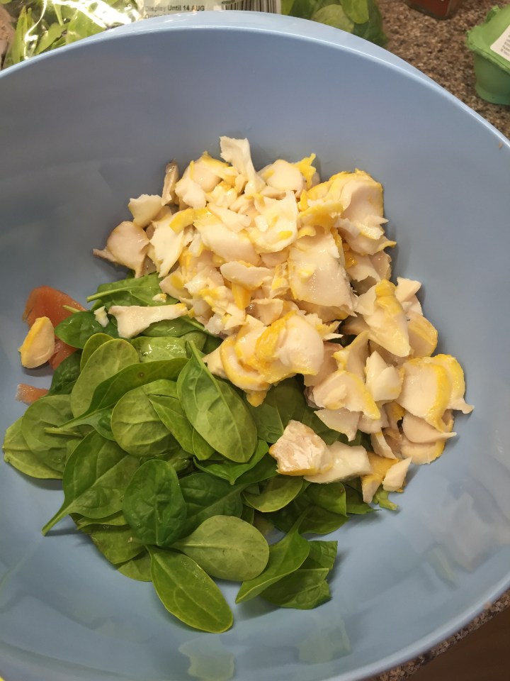Put the garlic, lemon, salmon and Spring onions in a large bowl with 3-4 handfuls of baby spinach