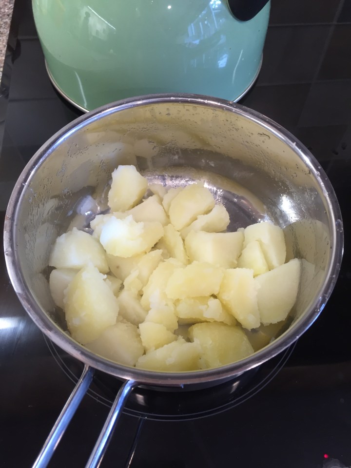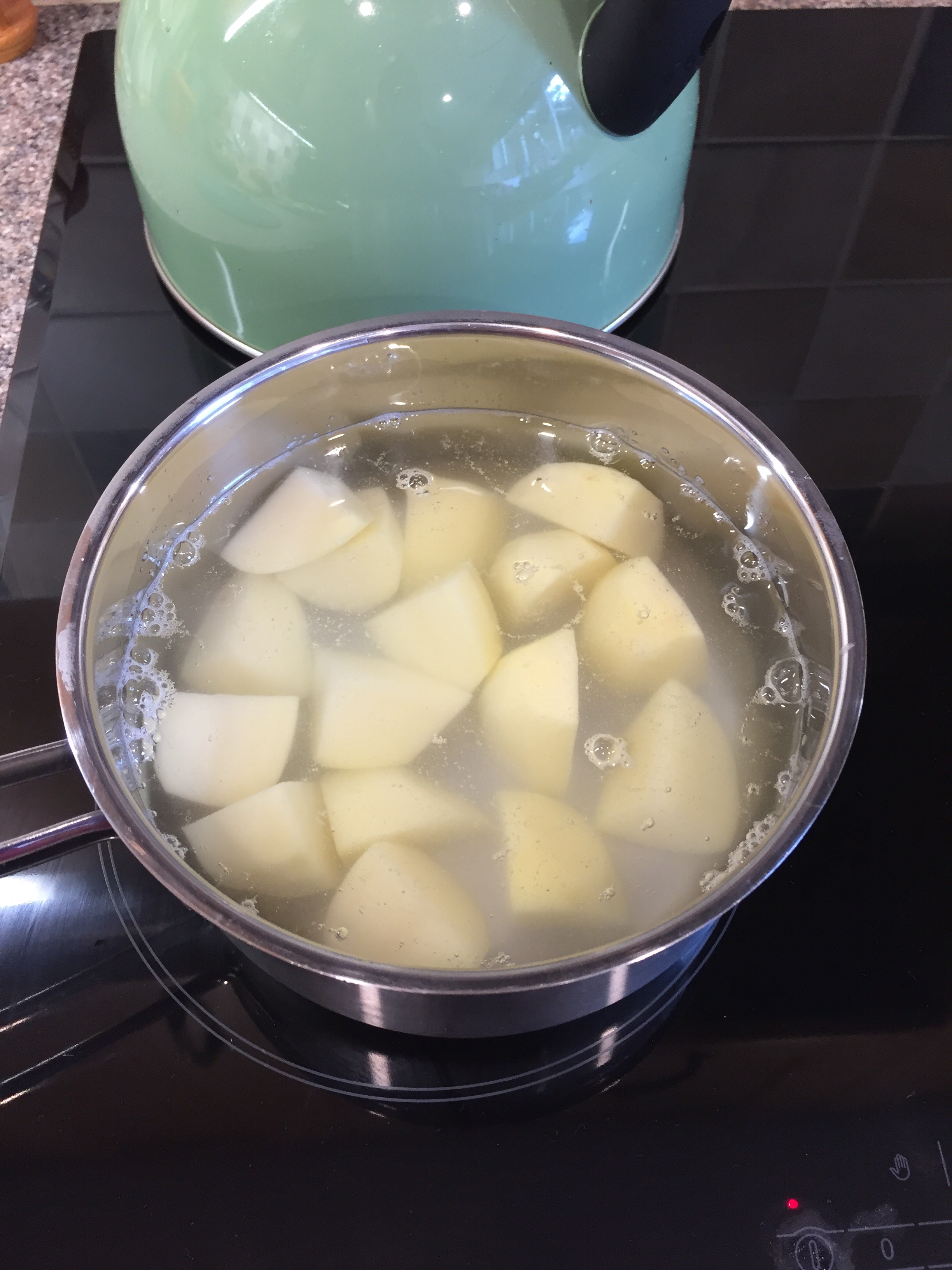 Peel and chop the potatoes- put them in a pan of cold water. Bring to the boil and simmer until soft.