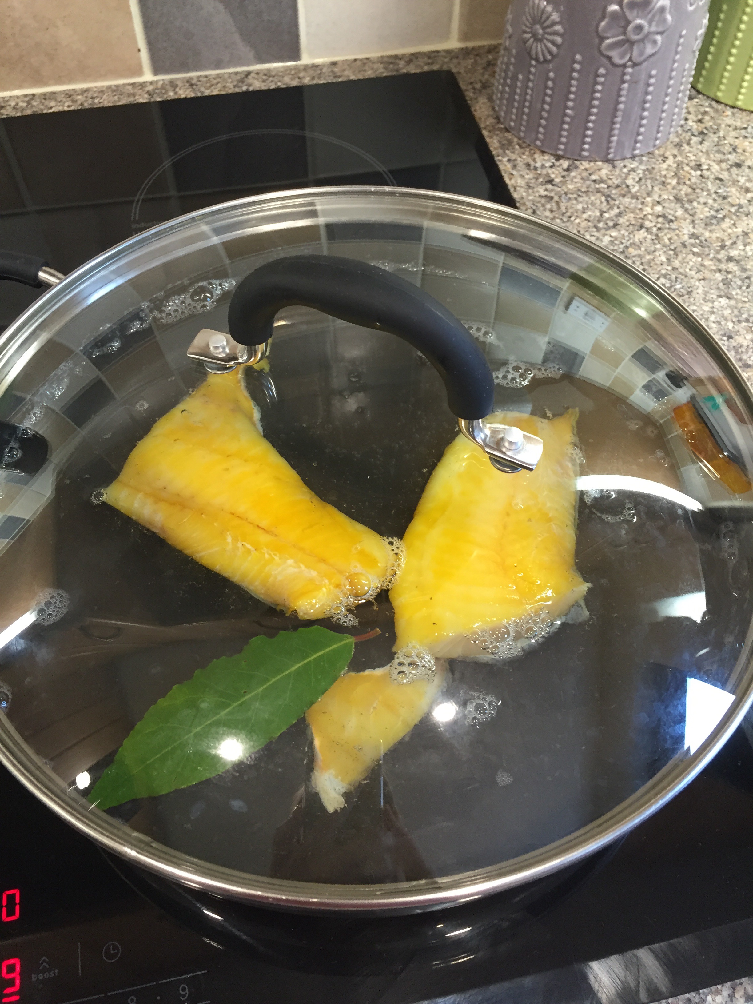 Meanwhile put the fish fillets into a large pan with the bay leaf. Cover with cold water and put the lid on. Bring to the boil then take the pan off the heat and leave for 5mins with the lid still on