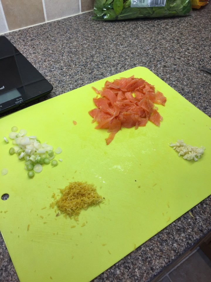 Meanwhile- slice the Spring onions, finely chop the garlic, finely grate the lemon peel and tear the smoked salmon into 1-2 inch pieces