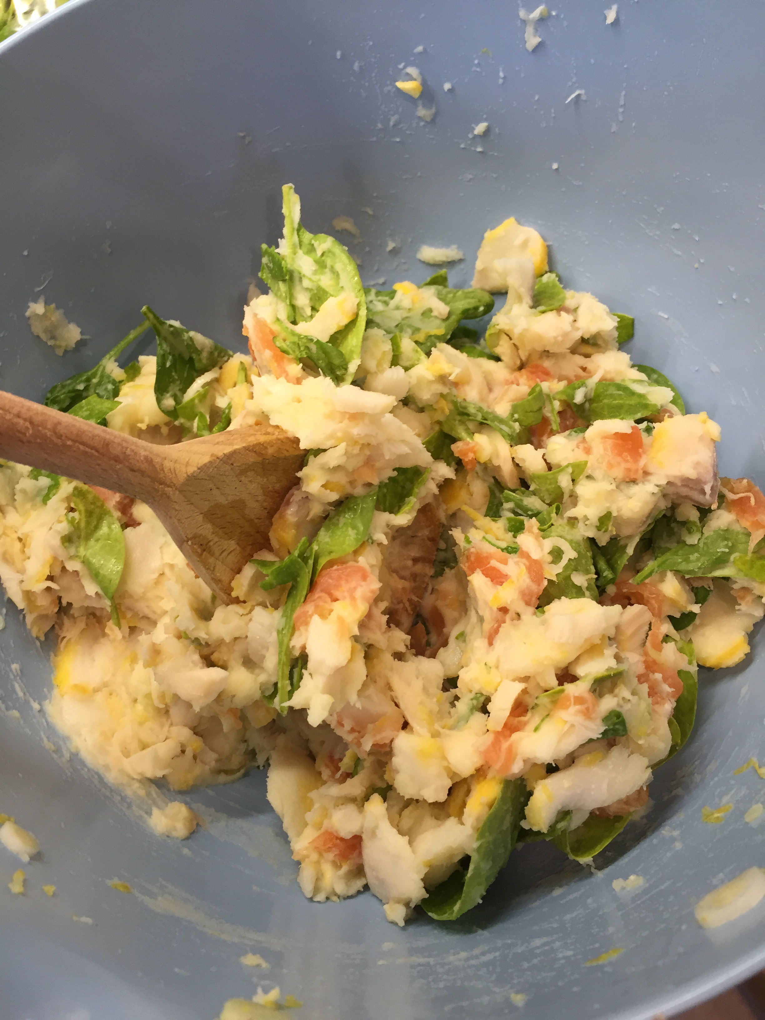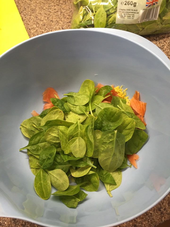 Put the garlic, lemon, salmon and Spring onions in a large bowl with 3-4 handfuls of baby spinach