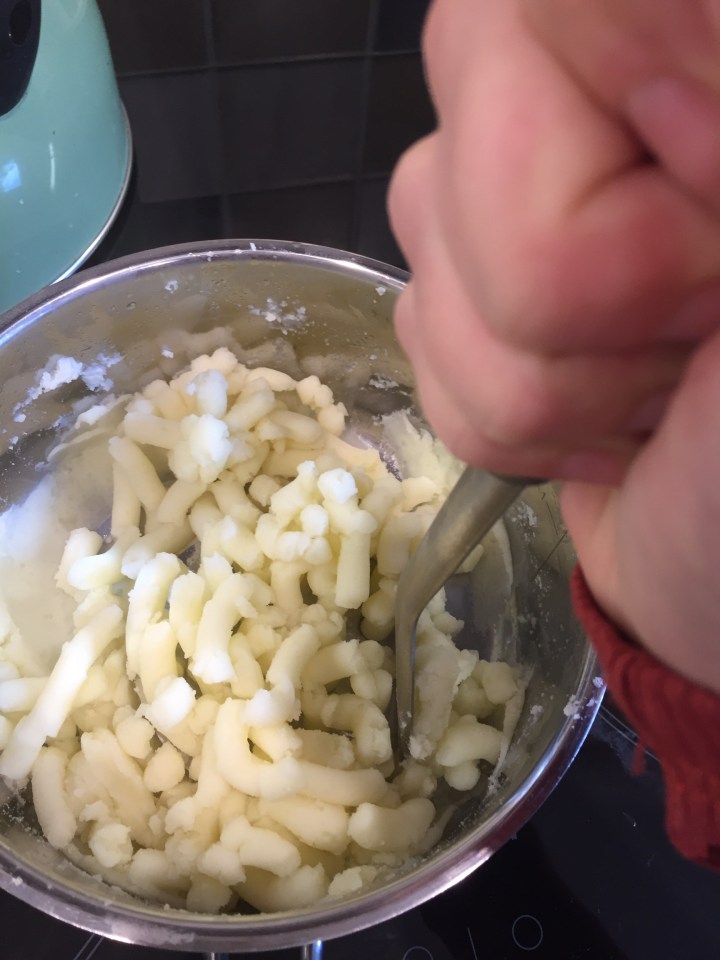 Drain the potatoes then put them back on the heat for a minute to get rid of some moisture