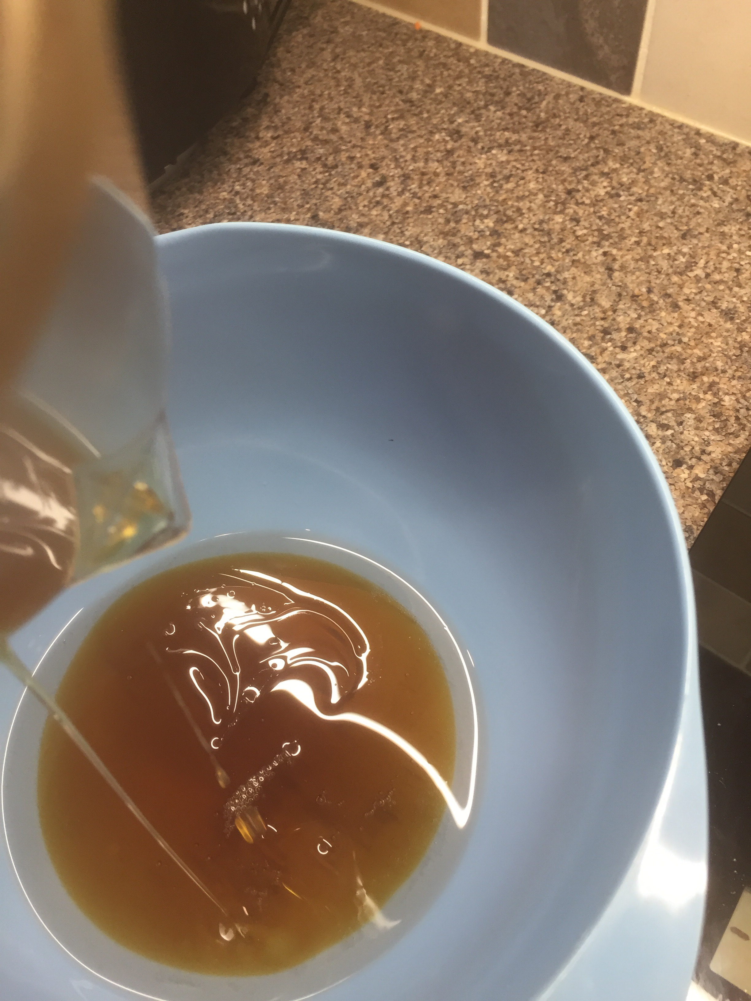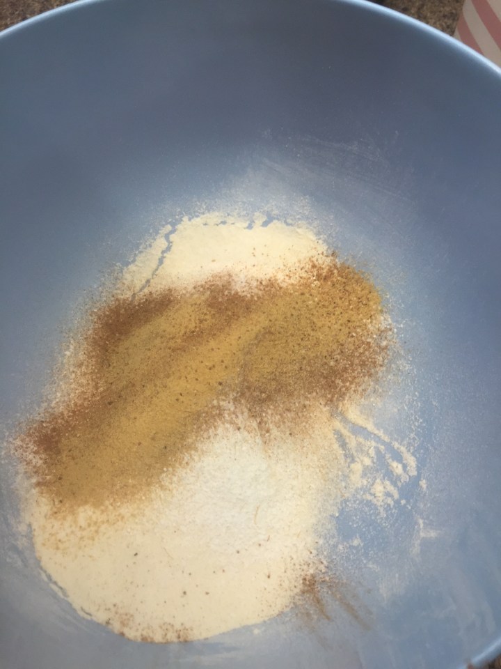 In a large bowl sieve in the flour, cinnamon, nutmeg, ginger, salt, bicarbonate of soda and baking powder. Mix together