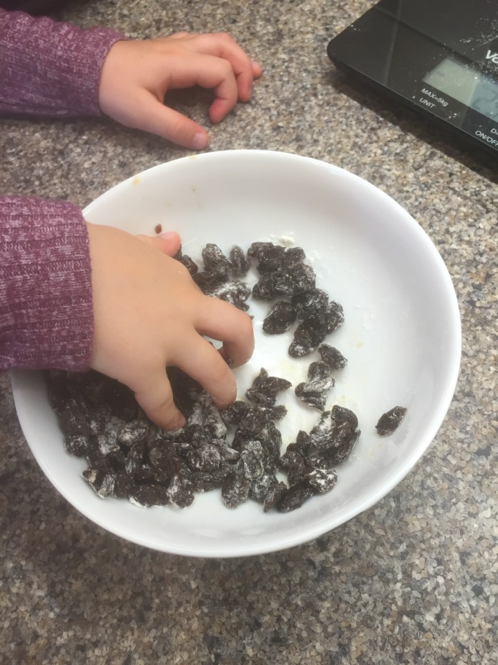 In a small bowl roll the raisins in a tablespoon of flour to stop them sticking together