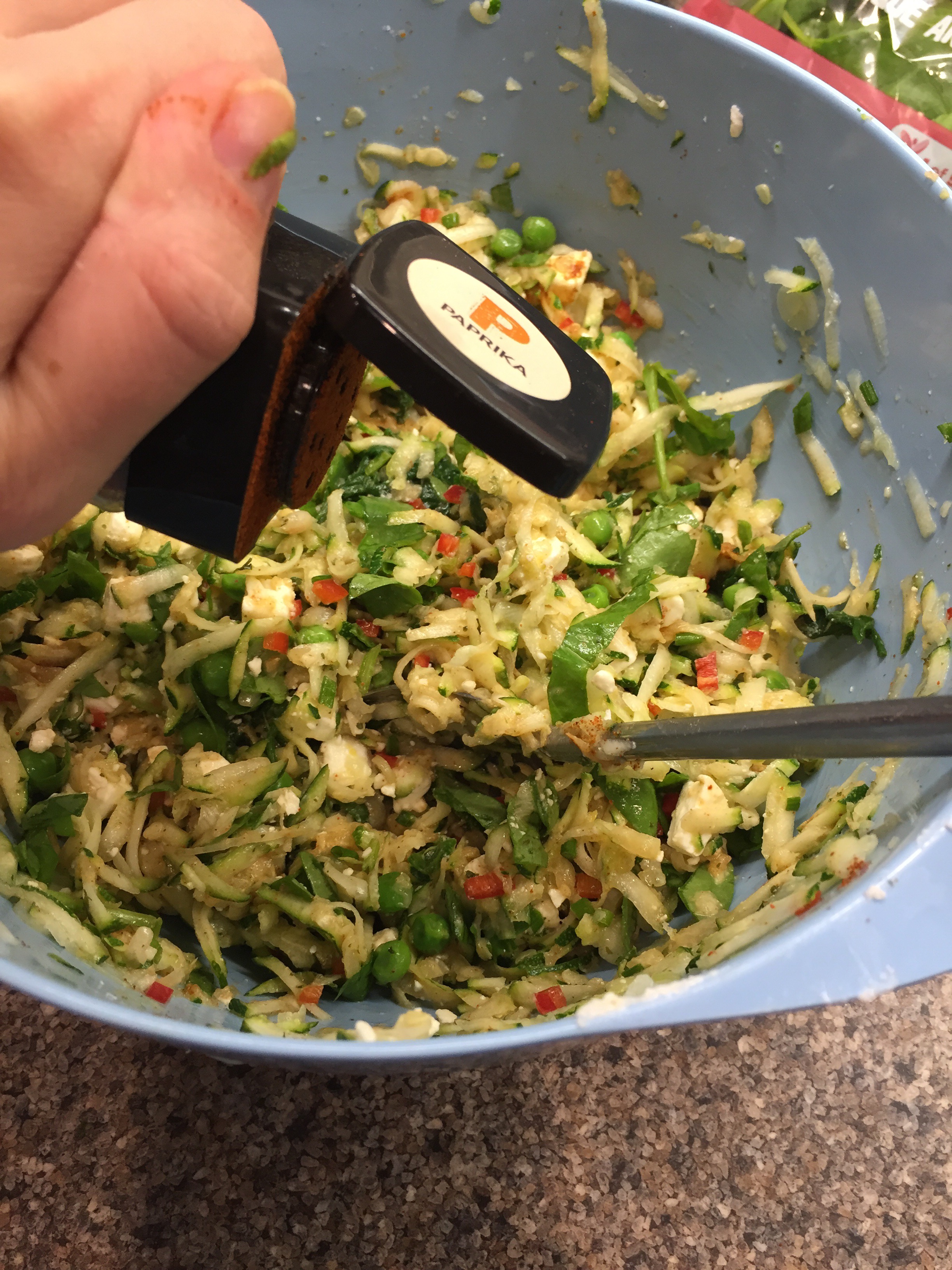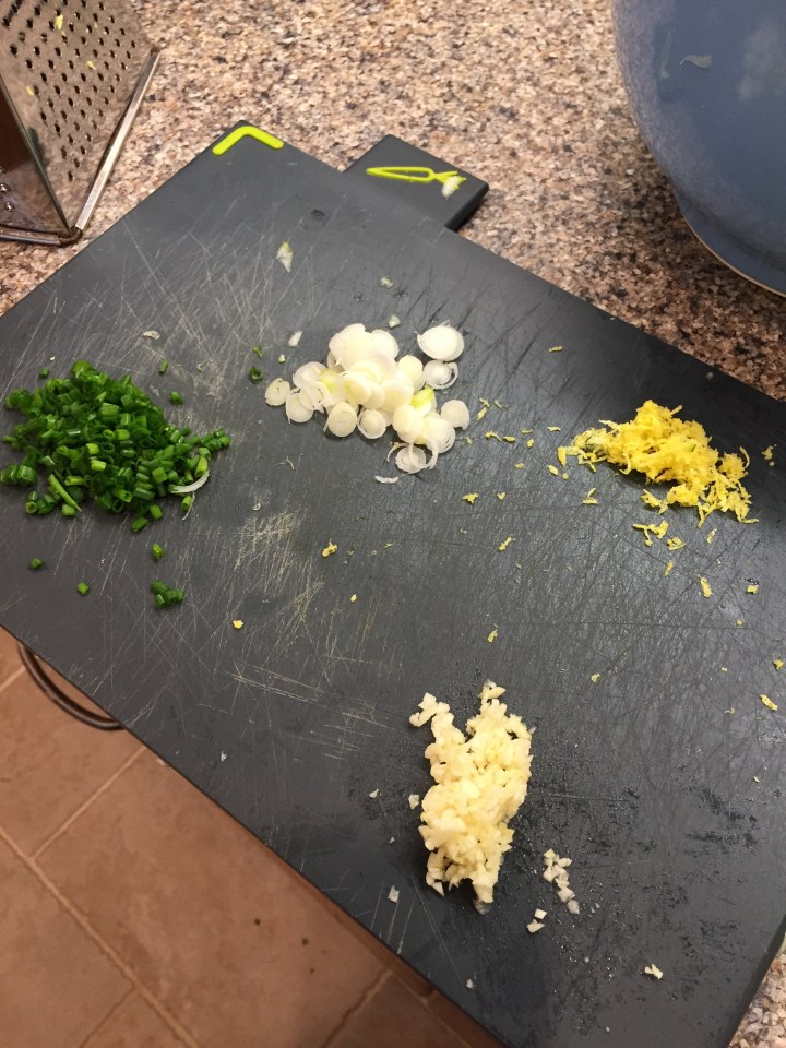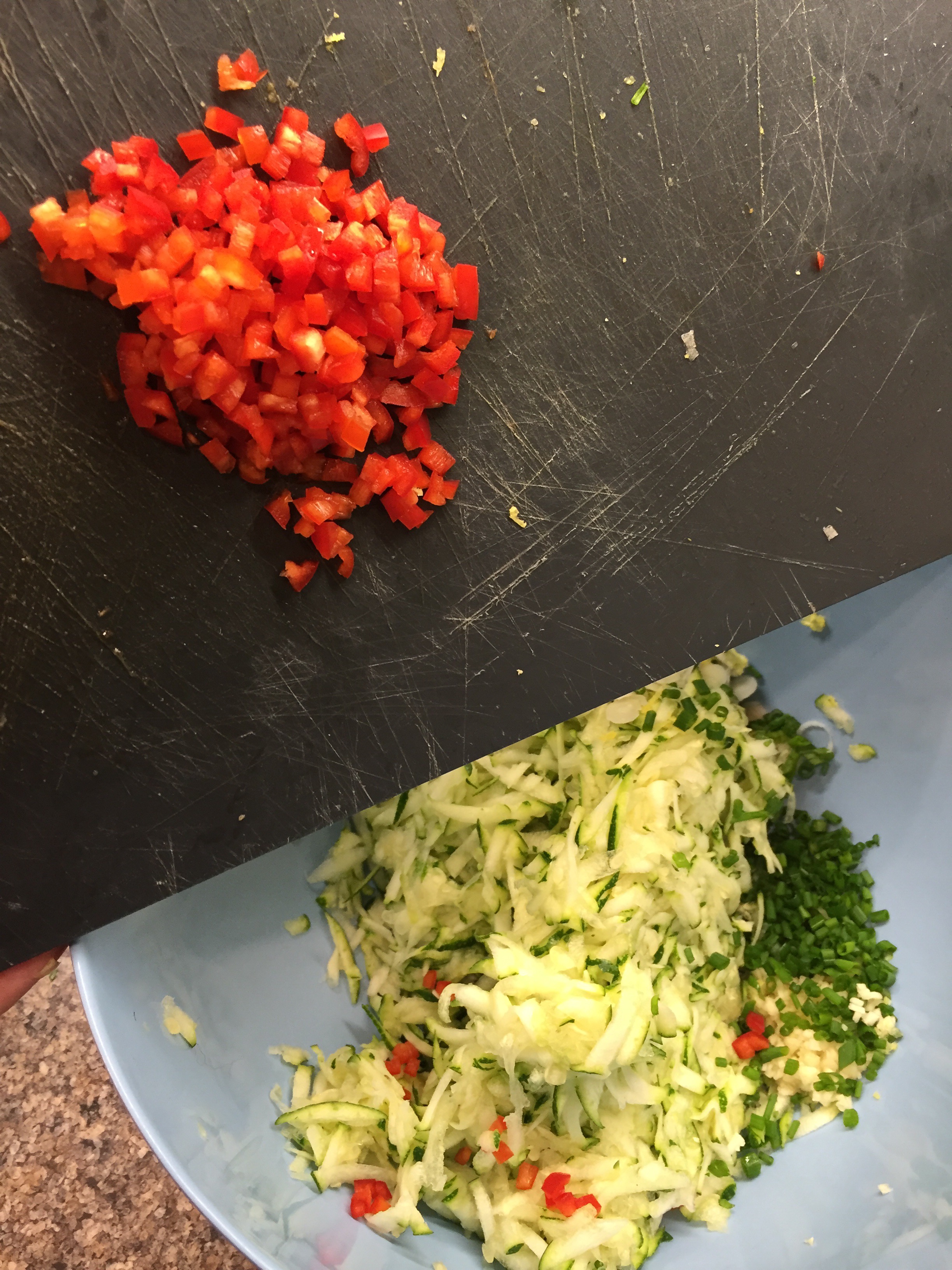 Chop the garlic, spring onions and chives and finely grate the skin of half a lemon- put in a bowl with the courgette.