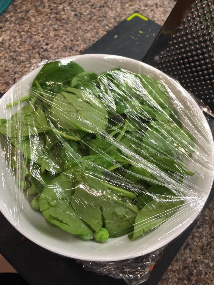 In a bowl put your peas and a couple of handfuls of spinach, cover with cling film, pierce and microwave for 2mins then add to the bowl with the other ingredients.