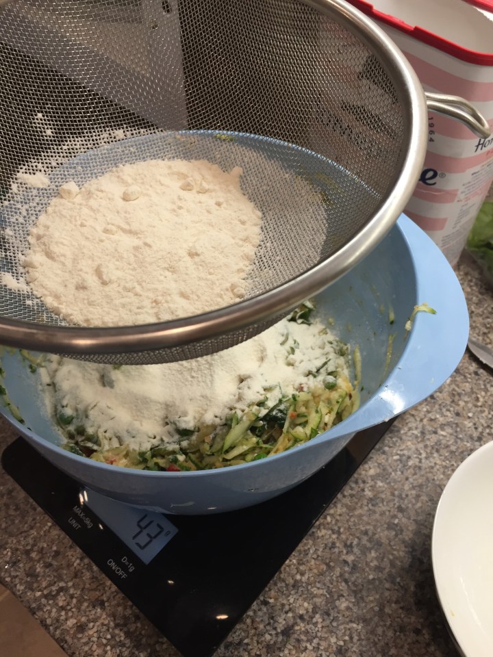 Sieve 85g of plain flour into the bowl and mix in. Now you’re ready to fry the fritters!!