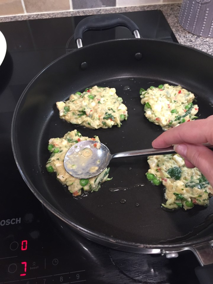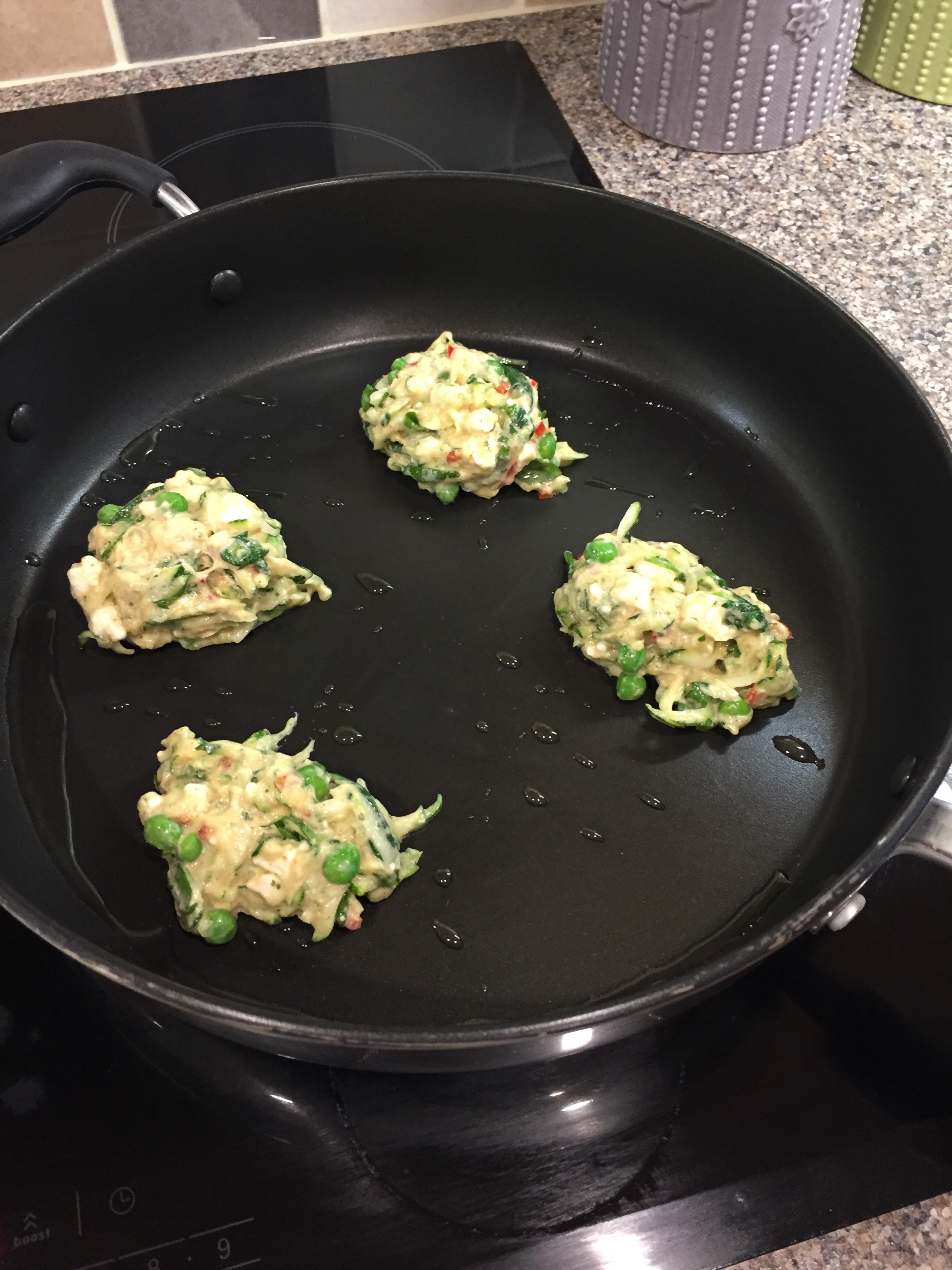 Heat some oil in a frying pan (medium heat) and spoon a tablespoon of mixture into the pan at a time- wait for 30secs.