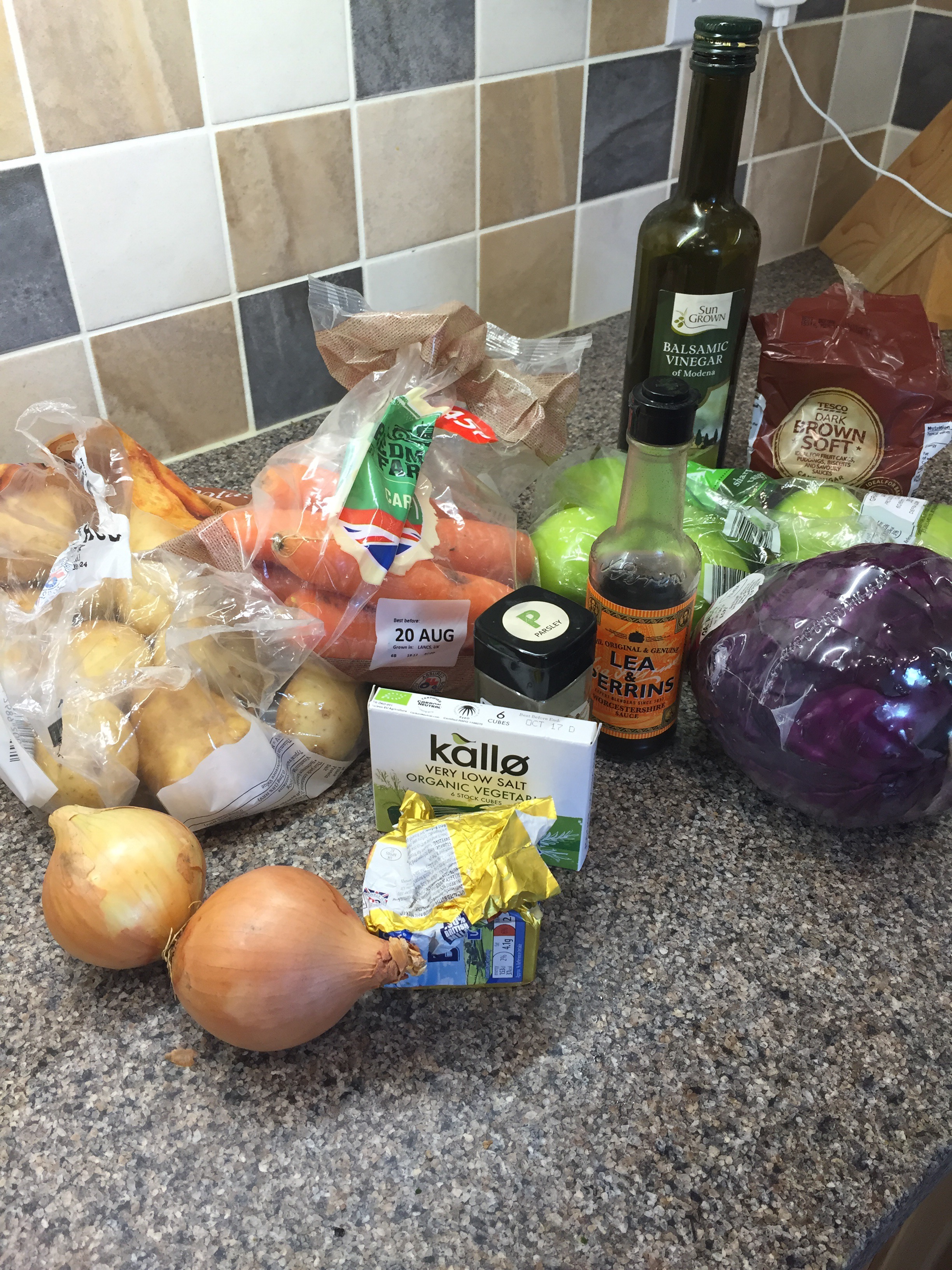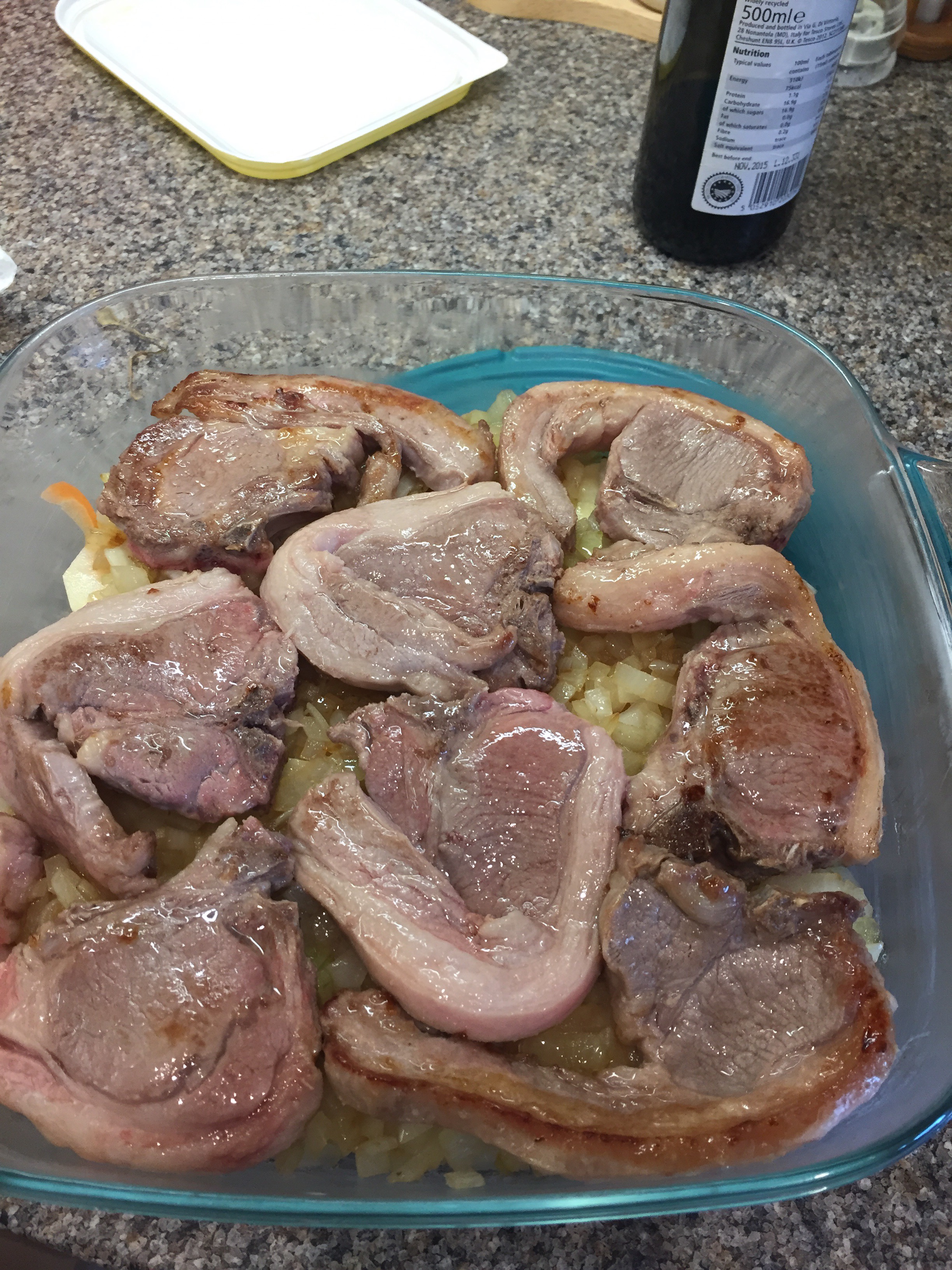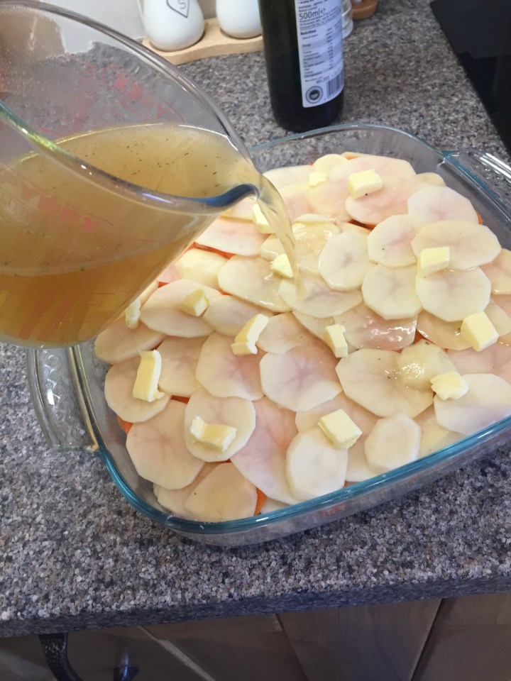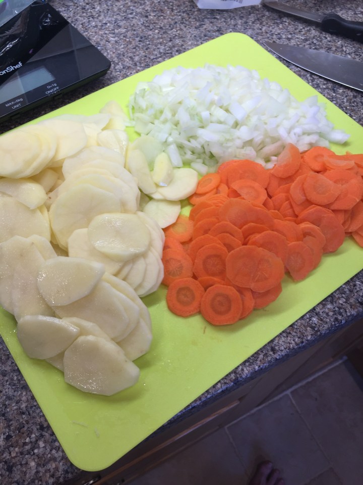 For the hot pot- dice the onions. Peel and Finely slice the potatoes and carrots. The thinner the slices the better. You can always peel and slice more later if you run out so don’t worry too much about how much to do- this was exactly the right amount of carrots for me but I needed another half a potato in the end.
