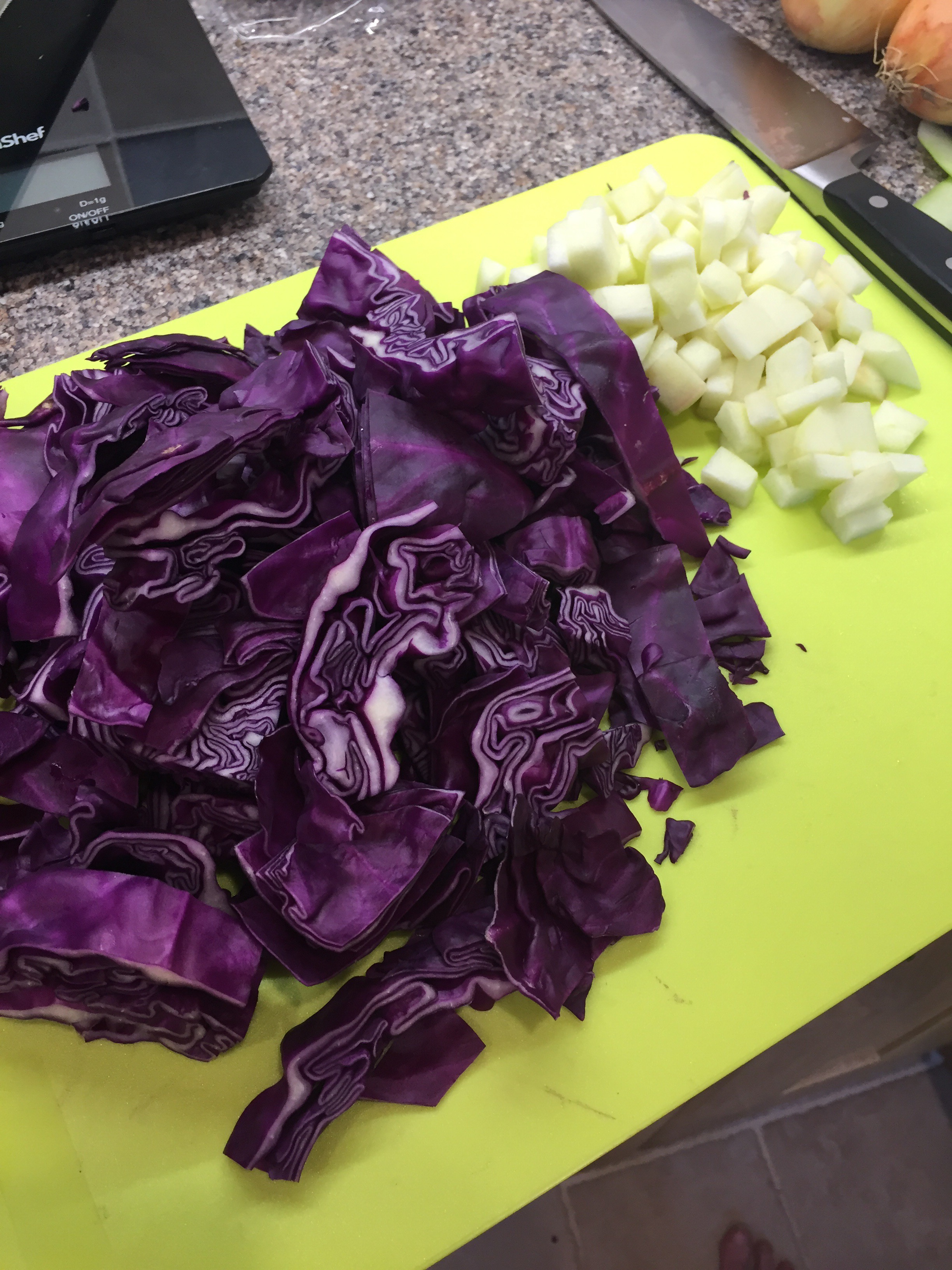 Slice the cabbage. Peel and dice 2 apples. I ended up only using half the cabbage (which is more than enough for 4 people!)