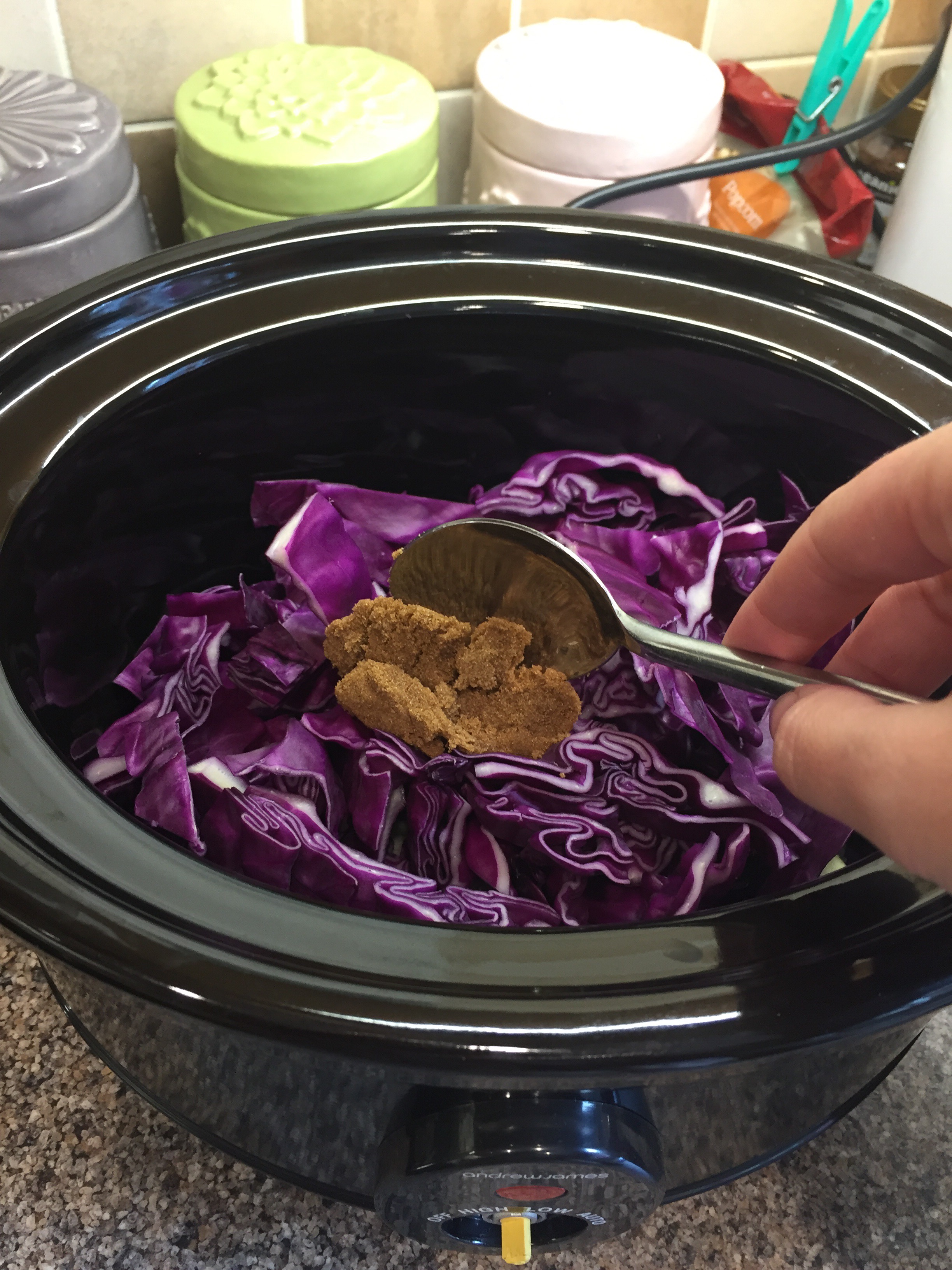 Put the cabbage and apple in a slow cooker with a tablespoon of brown sugar