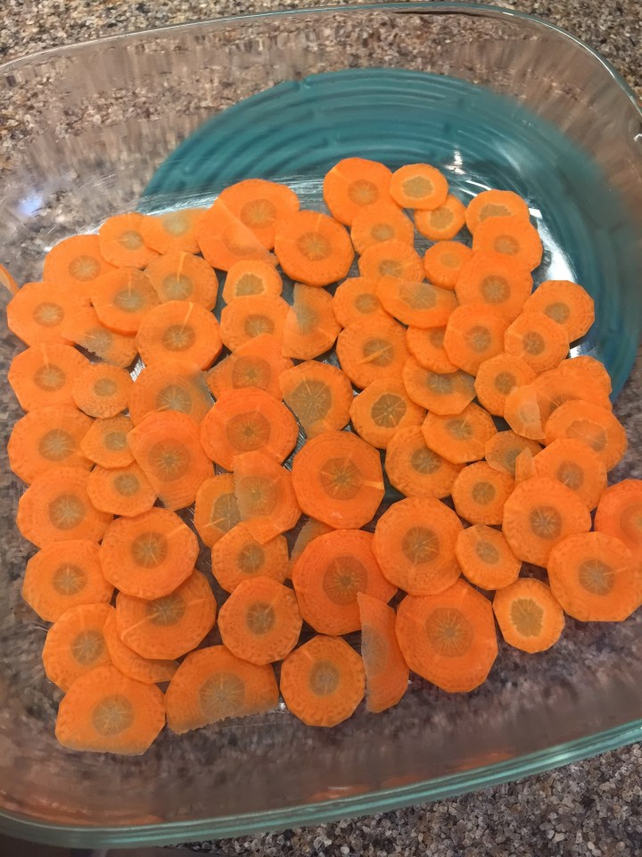 Lightly grease an ovenproof dish and start to layer everything up. Start with a layer of carrots