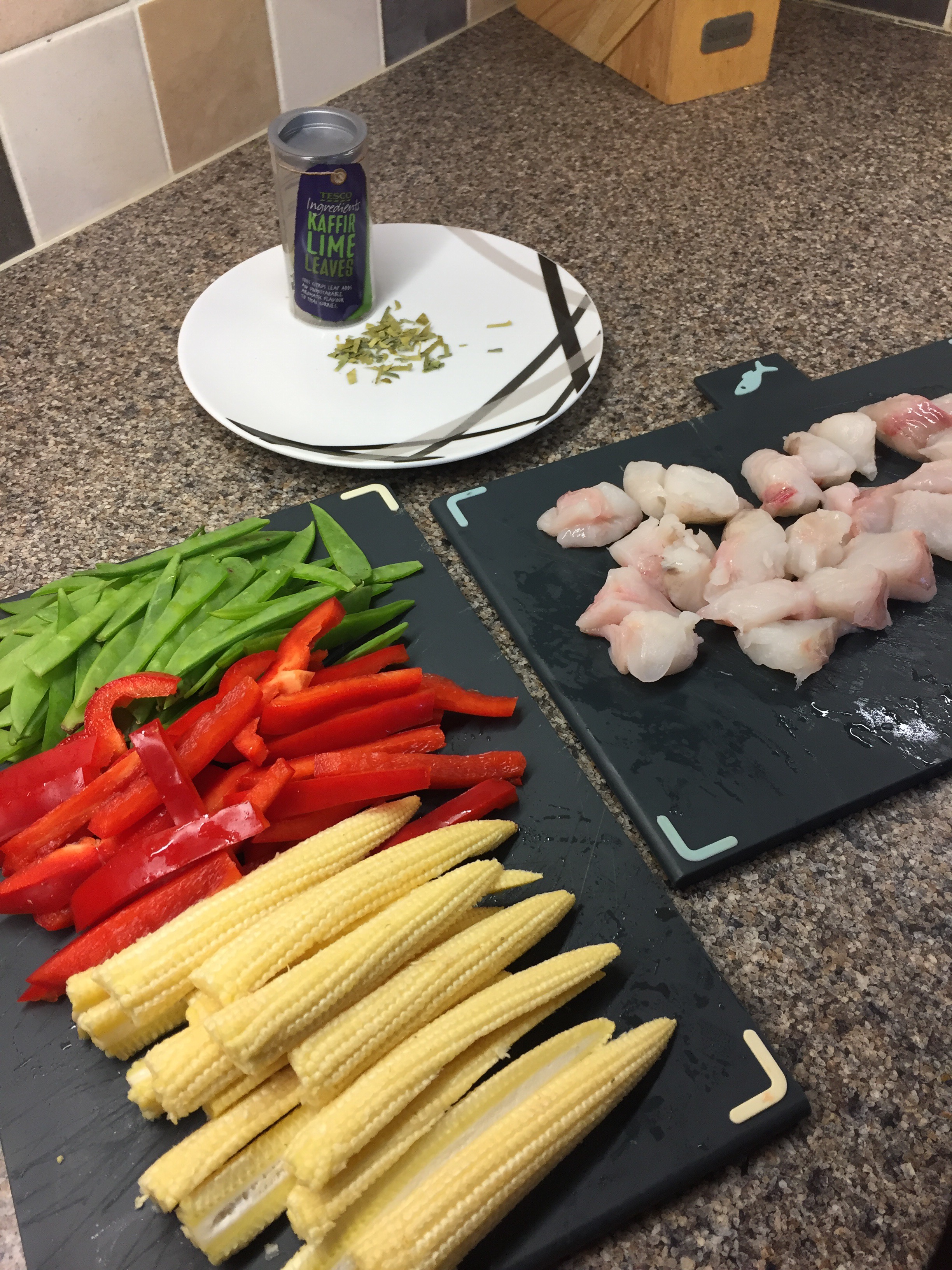 Slice the mange tout and baby sweetcorn in half lengthwise and cut the pepper into strips. Cut the fish into chunks. Finely chop 2 kafir lime leaves.