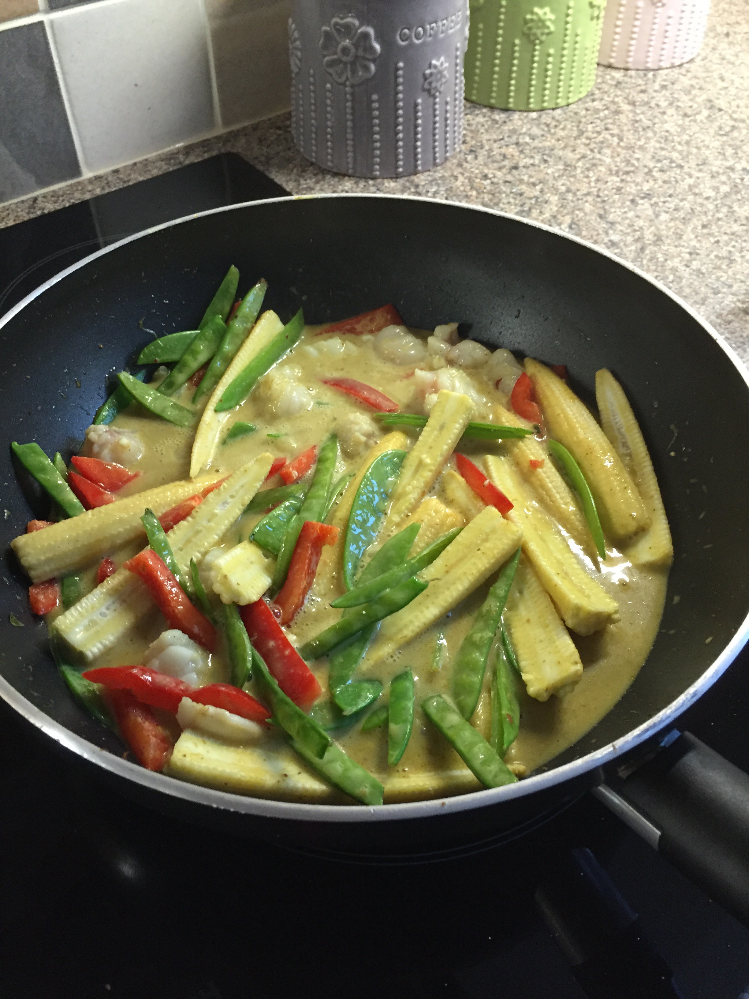 In a wok like pan heat a little oil and fry a tablespoon of curry paste for a couple of mins (if you want it hotter make it 2-3 tablespoons but we find one tablespoon makes it tame enough for the toddlers taste buds)