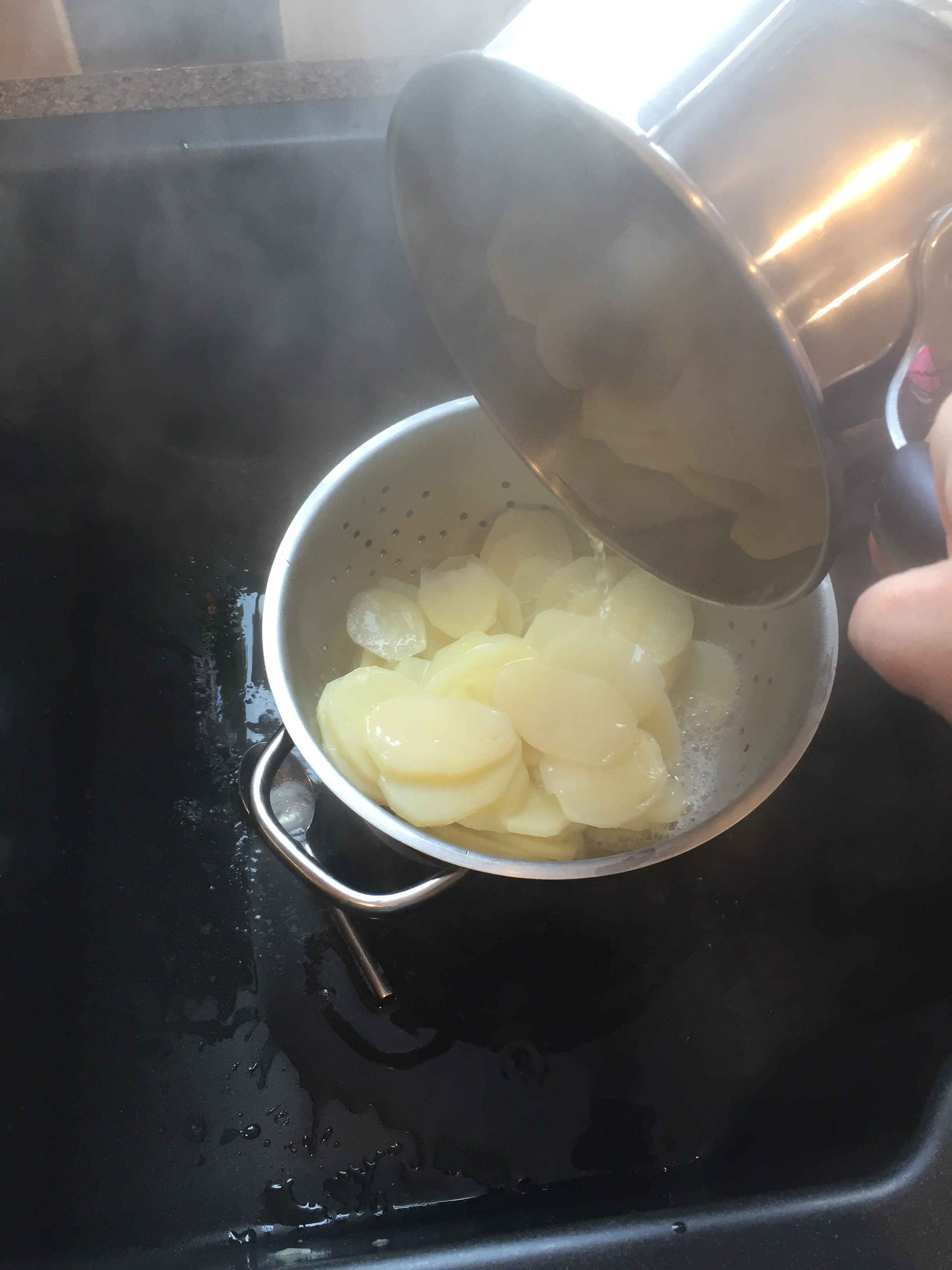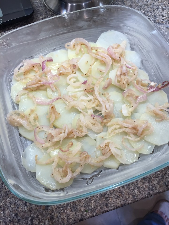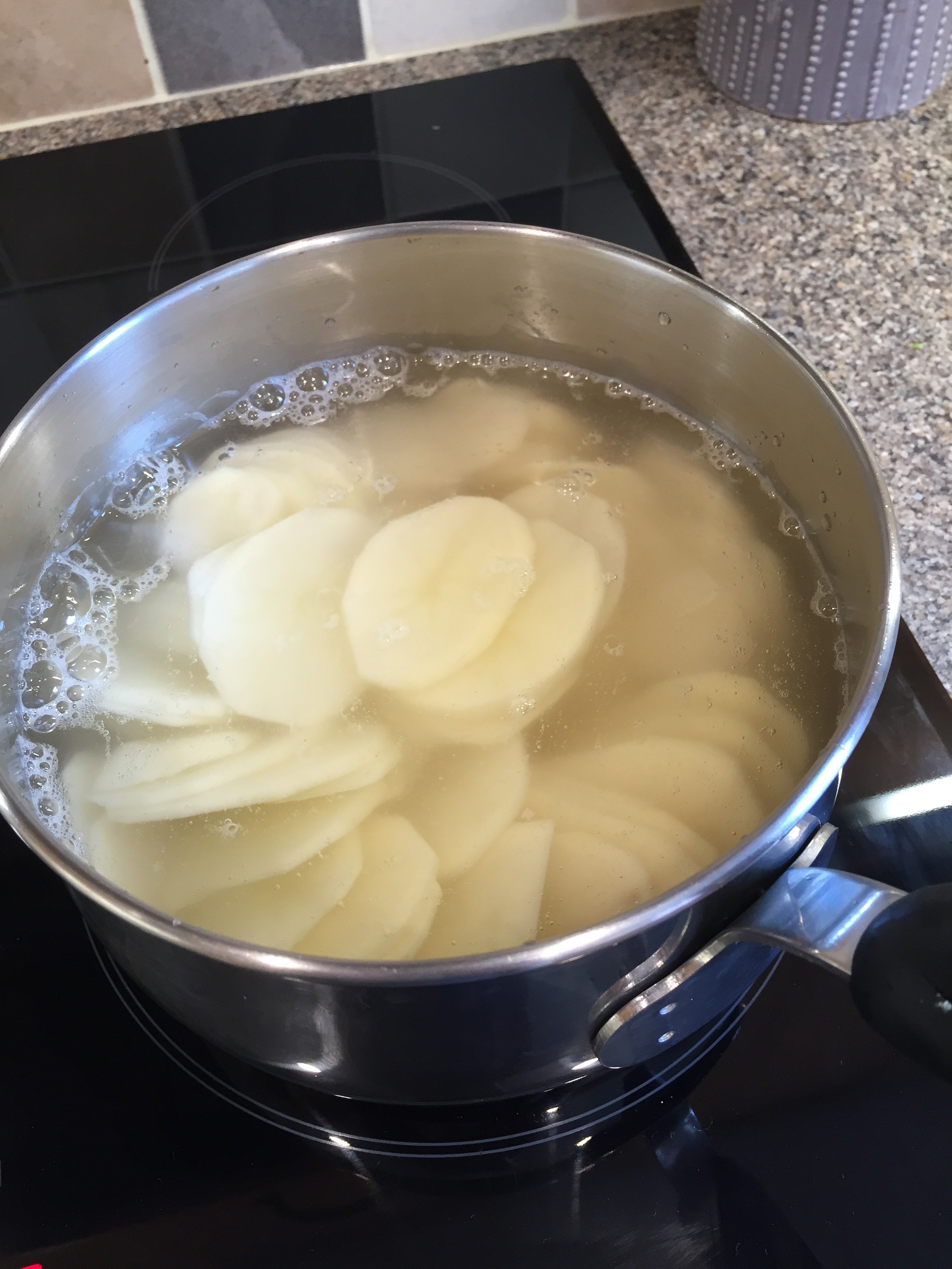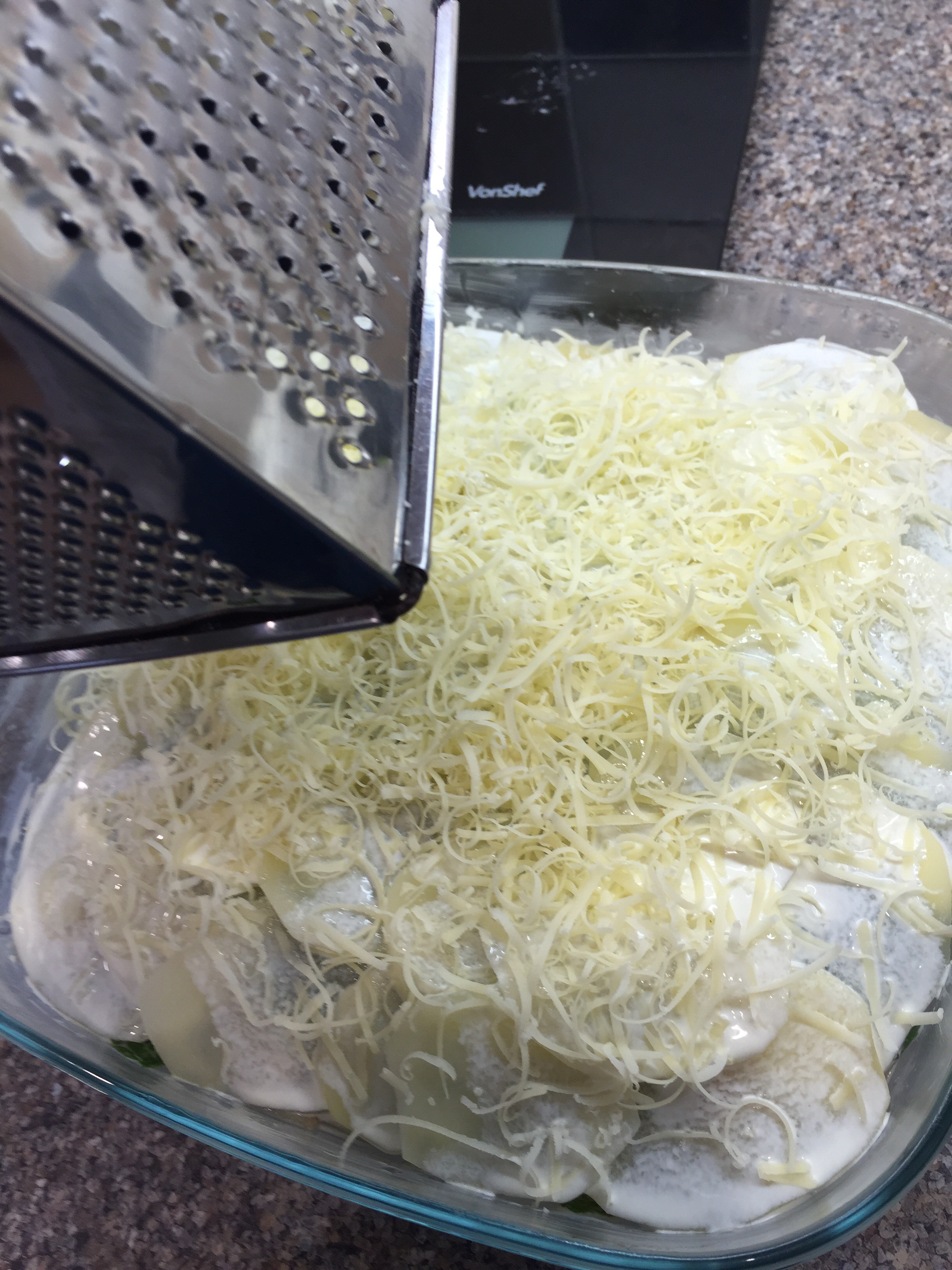 Half the spinach and peas. Repeat the layers and finish off with an extra layer of potatoes.