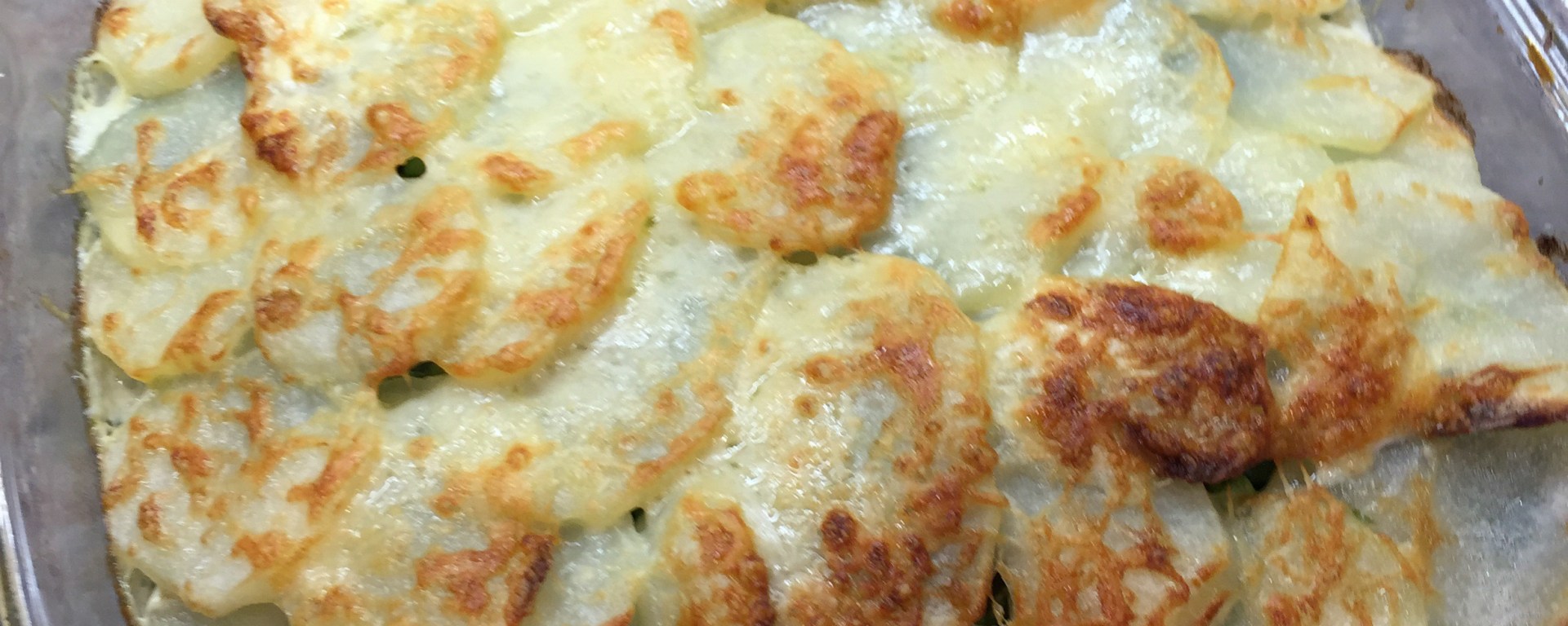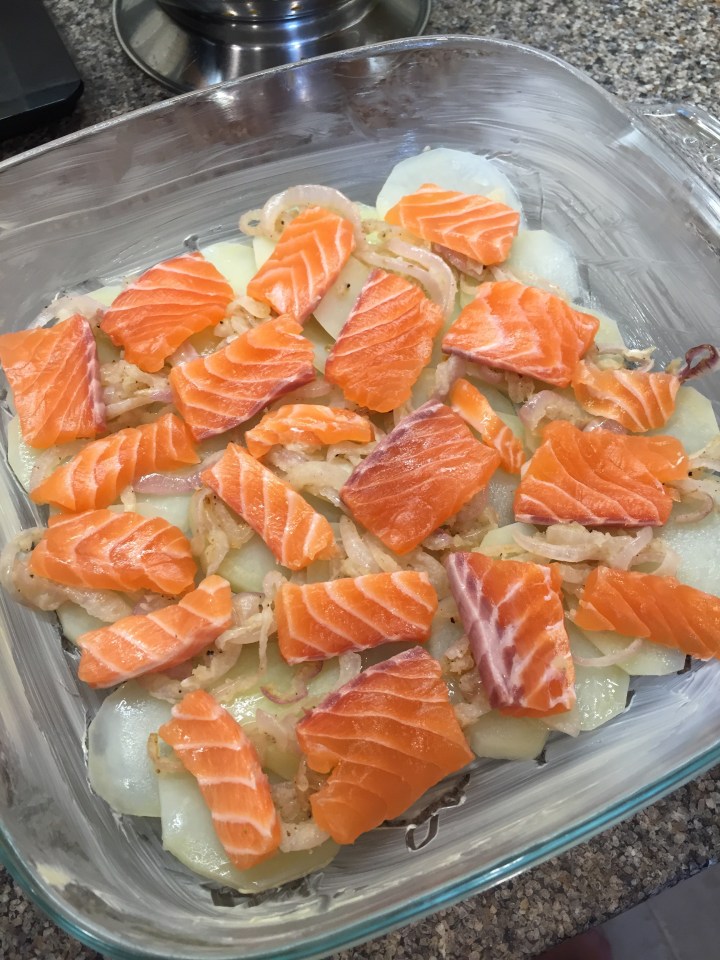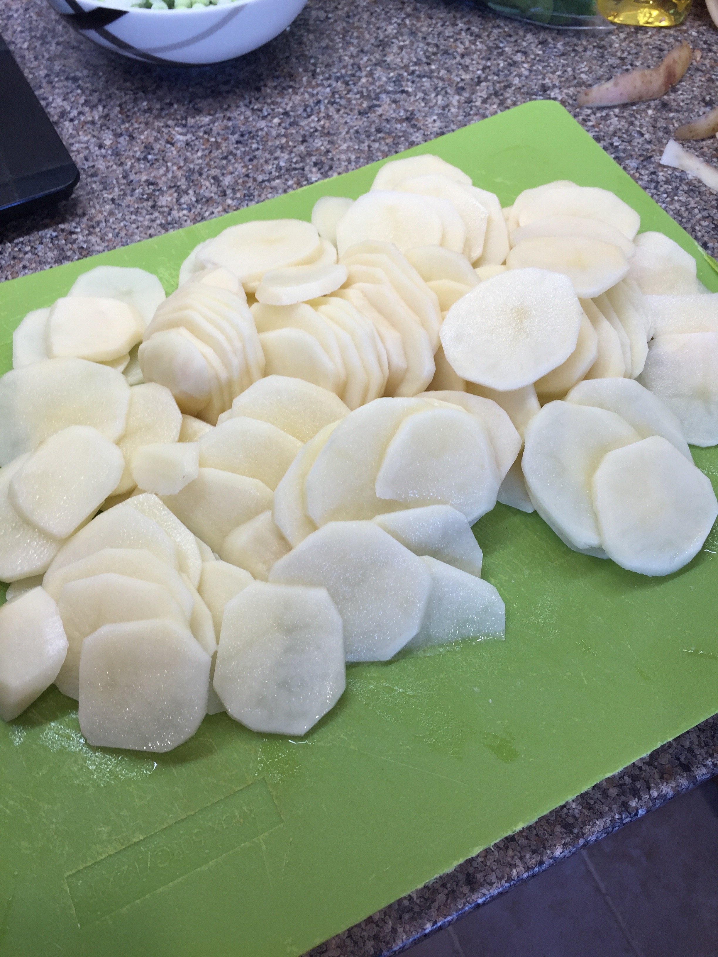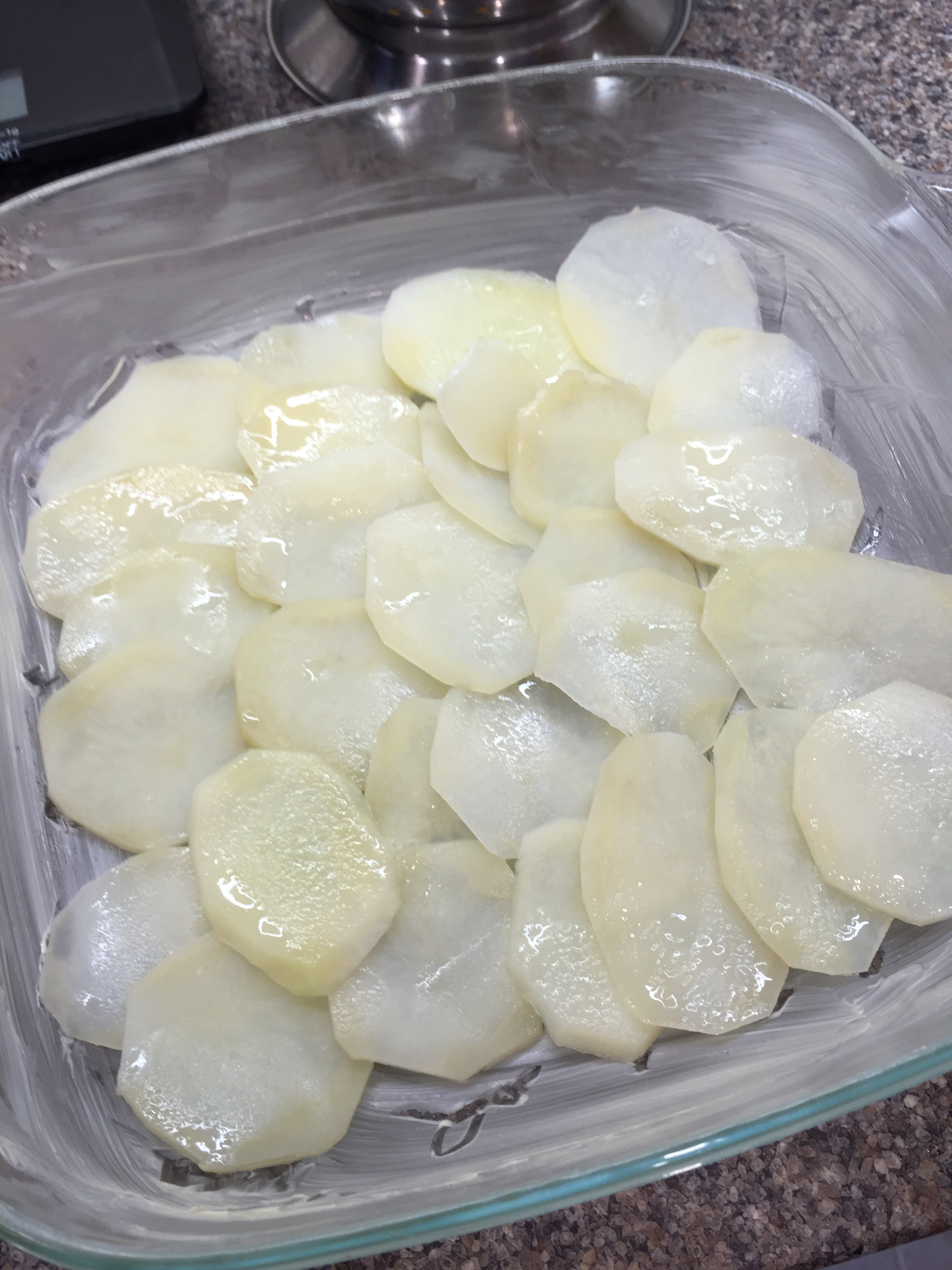 Half the spinach and peas. Repeat the layers and finish off with an extra layer of potatoes.