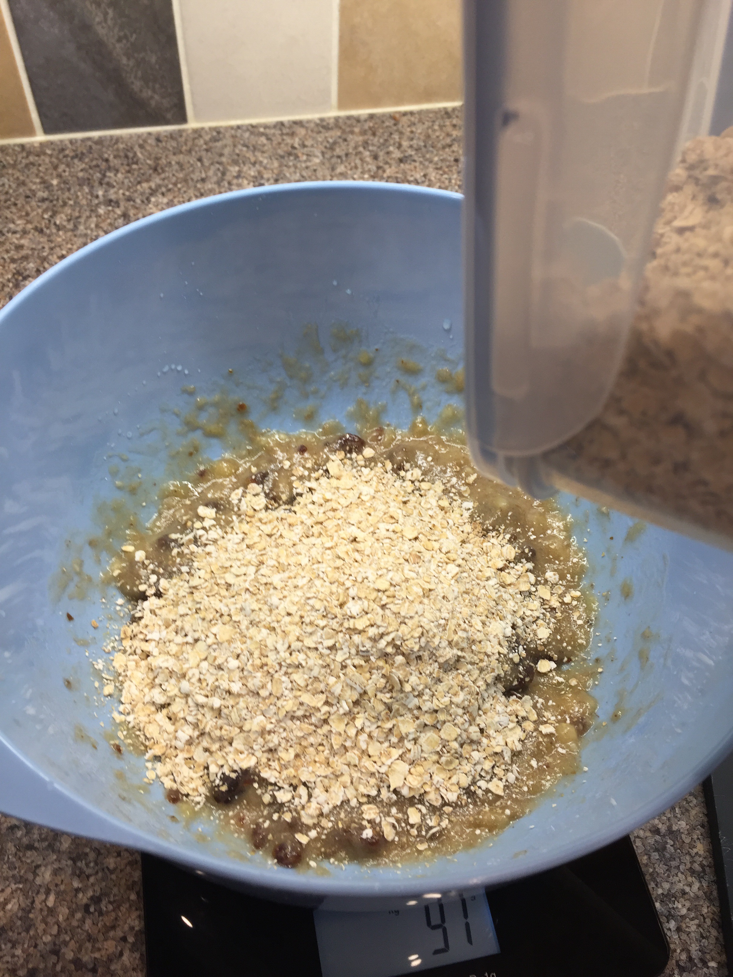 Add 160g of oats and mix together.