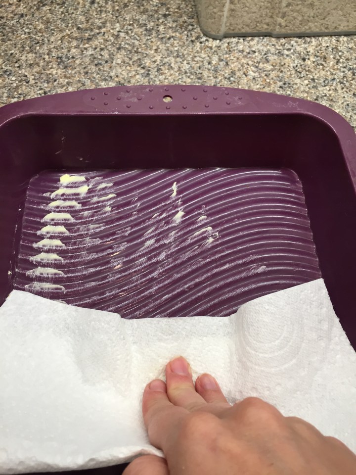 Grease a square baking tin (I’m using a silicon one as I find it easier to tip out at the end)