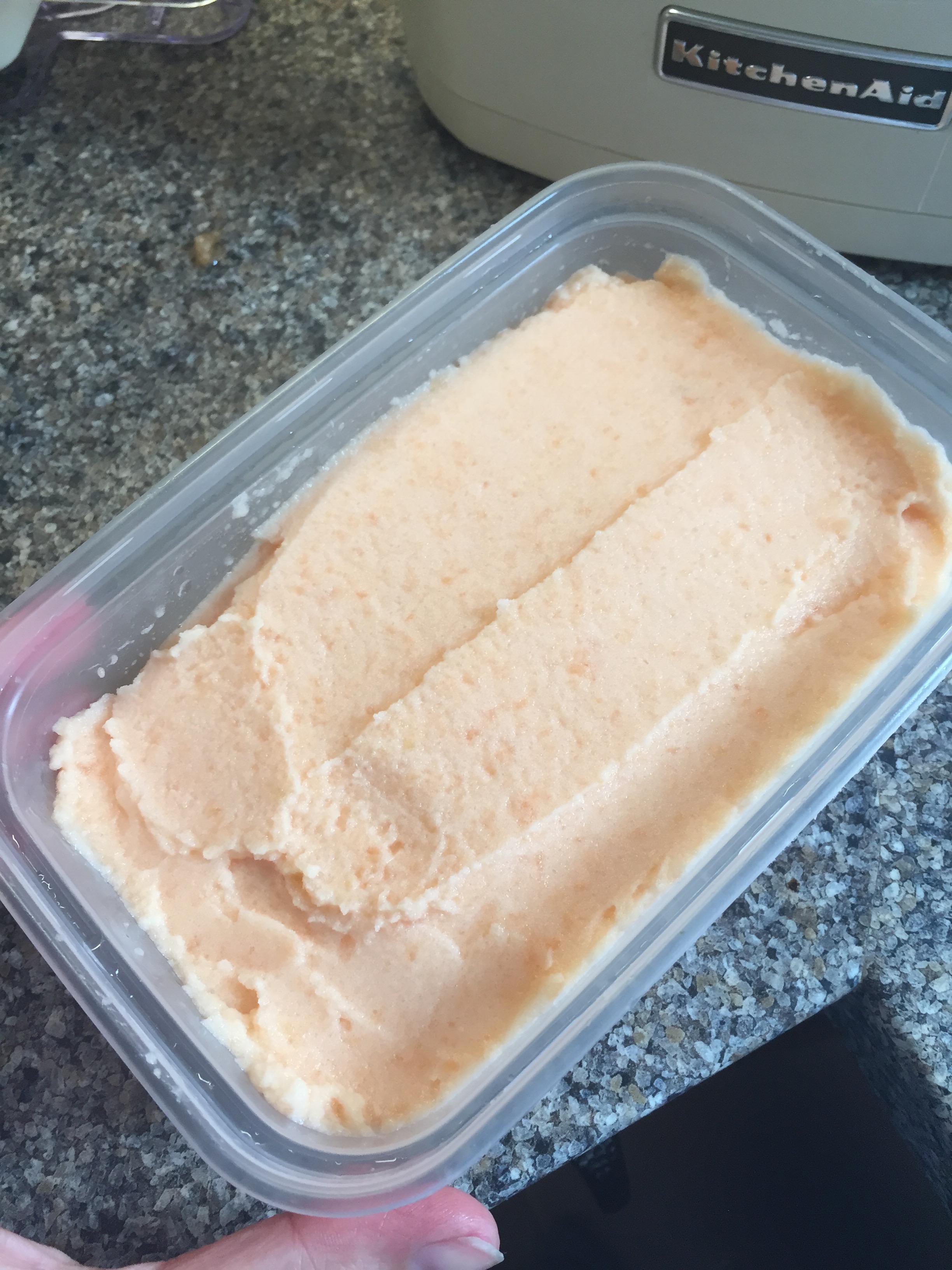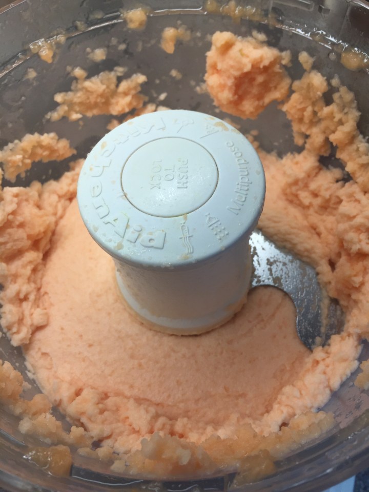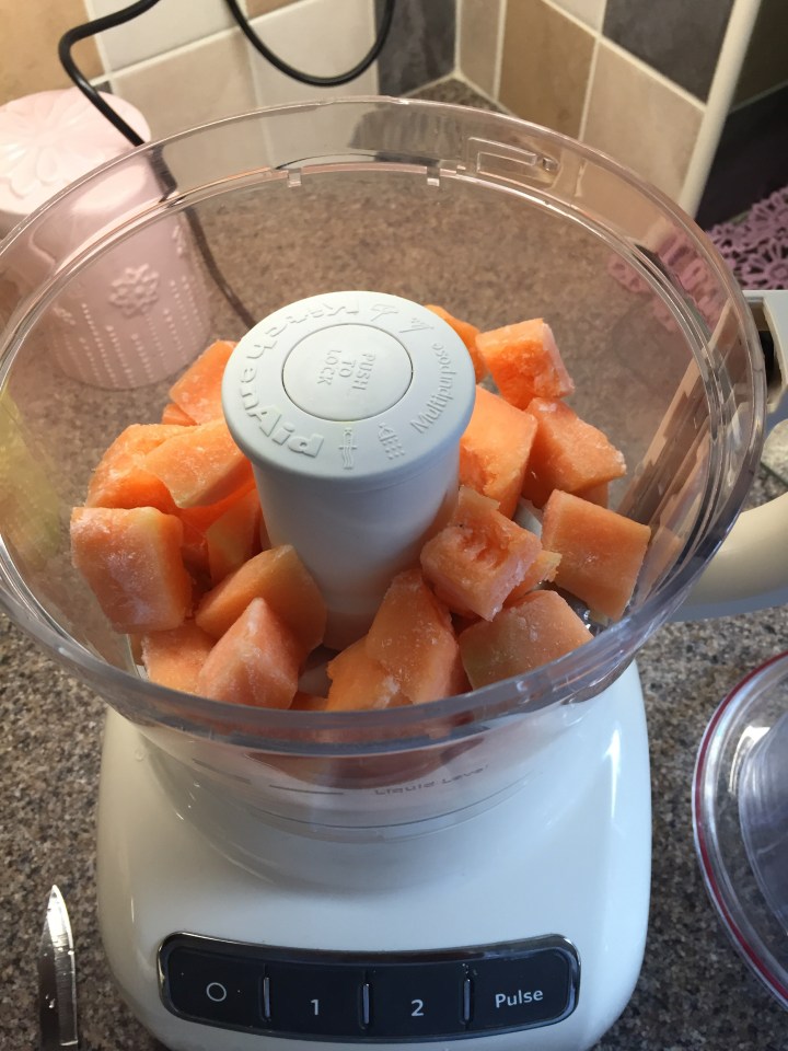 I forgot to take a picture of the very first step which is to cut your melon into chunks and put it in the freezer overnight. If you’ve got more room in your freezer than I do its best to separate the chunks so they don’t freeze into one big clump like mine did!