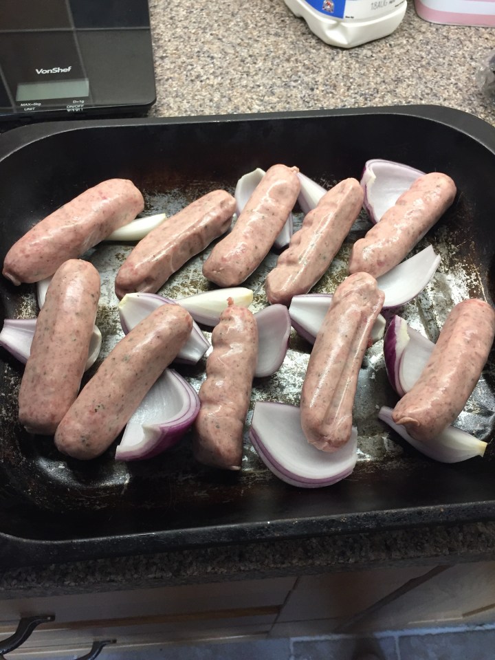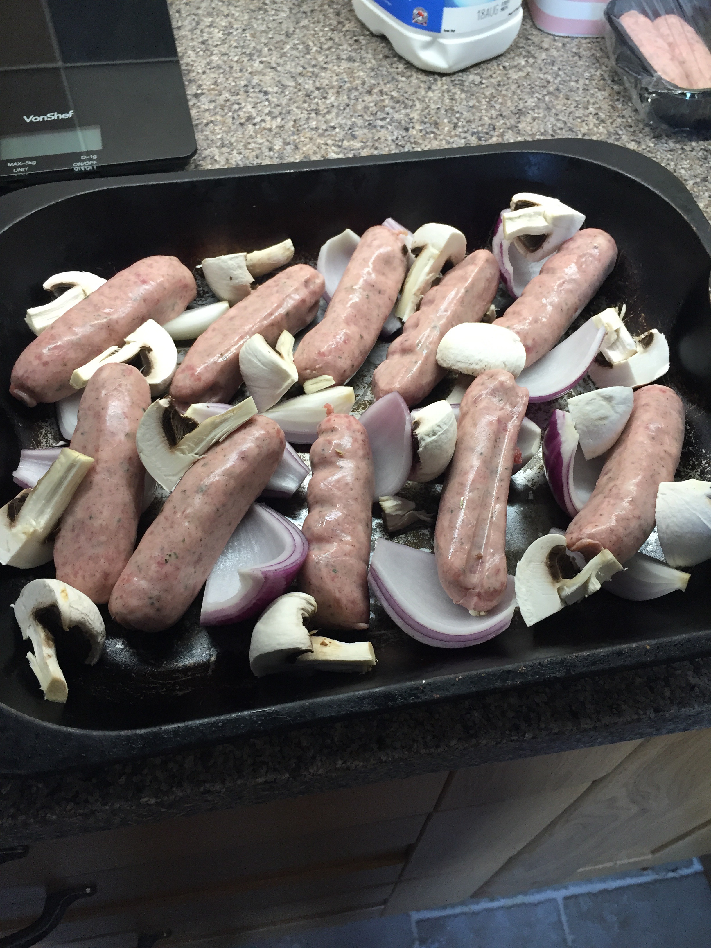 Arrange your sausages over the top. Make sure you use good flavoured sausages- these ones are Cumberland.