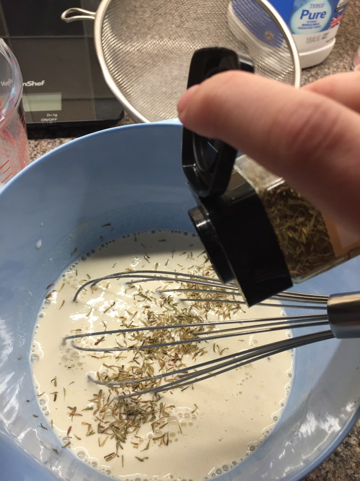 Add 2 teaspoons of whole grain mustard and a teaspoon of fresh or 2 teaspoons of dried thyme. Stir.