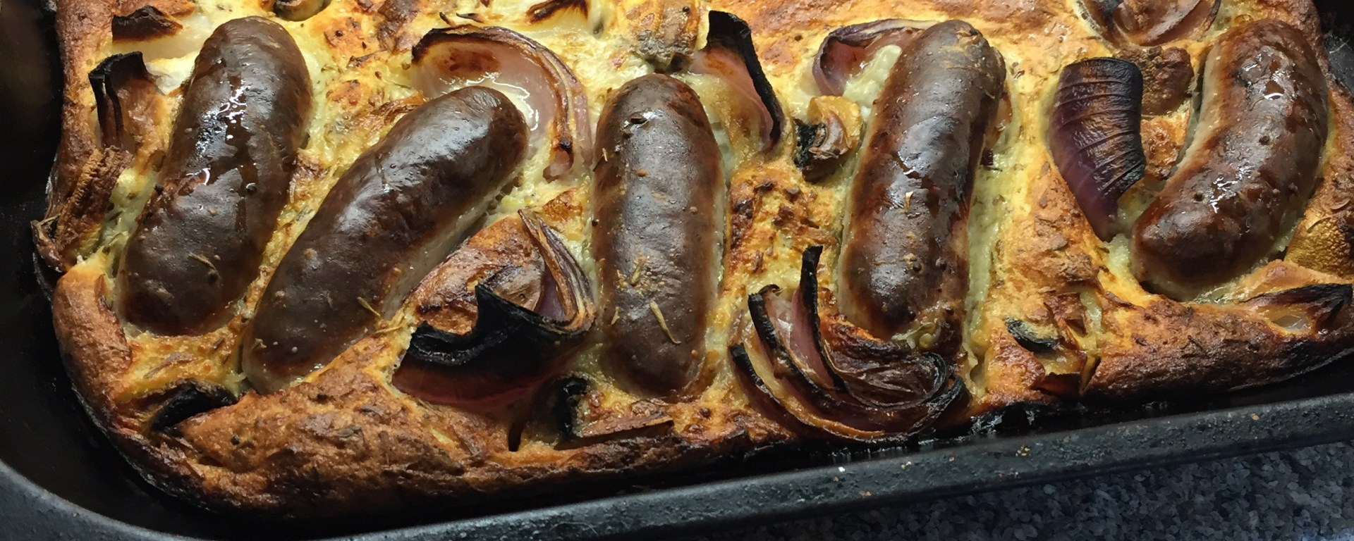 After 20mins in the oven remove and quickly pour the batter over the sausages before returning to the oven for around 40mins