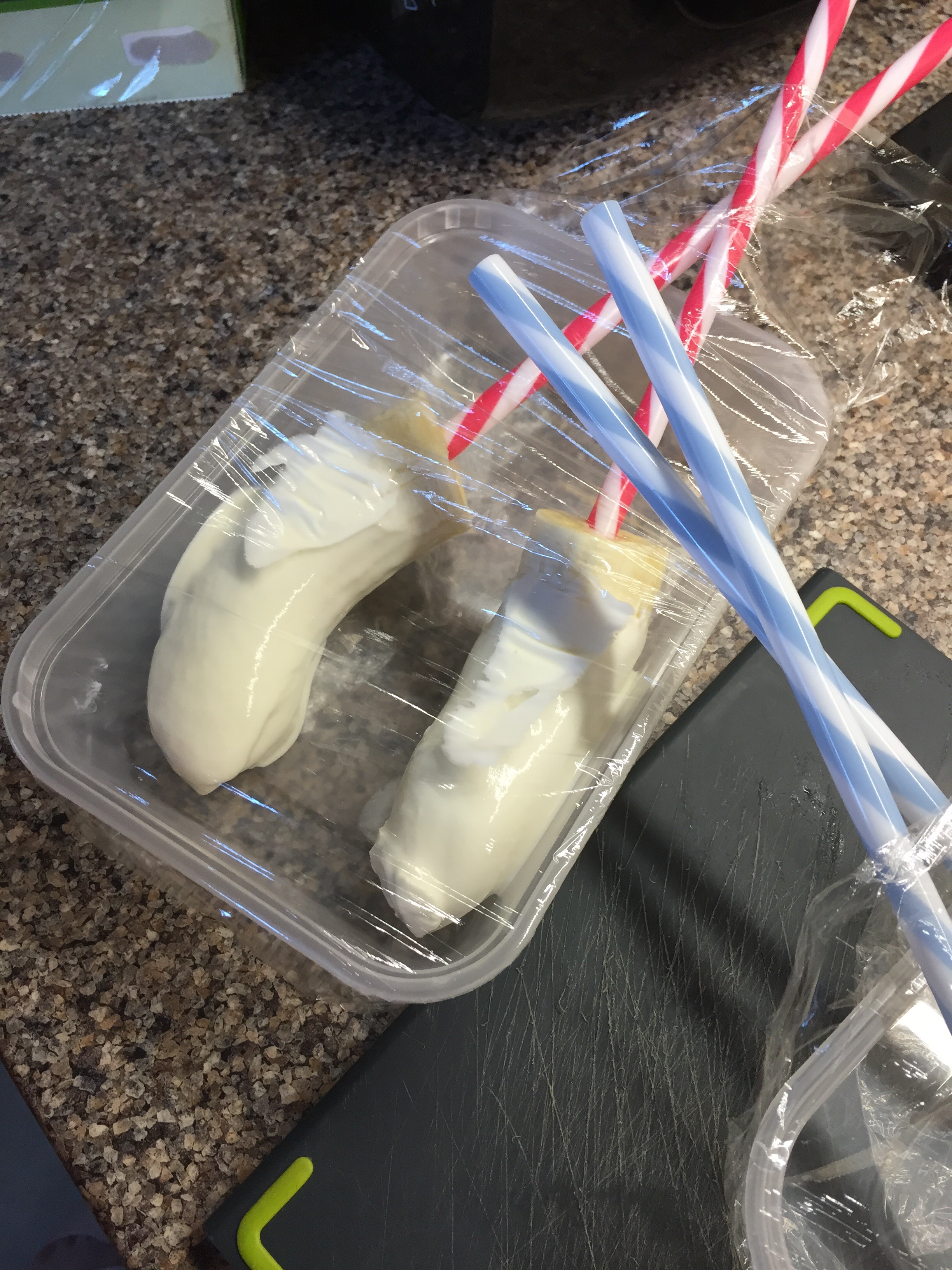 Pop the covered bananas into a pot or on a plate making sure they don’t touch.