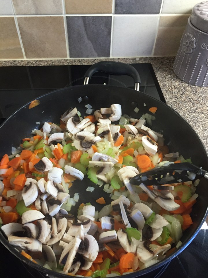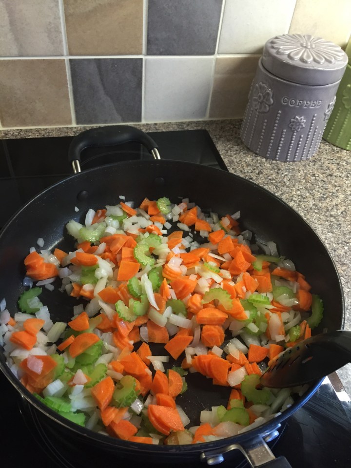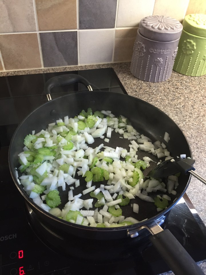 On a medium heat cook the onion, garlic and celery in a little oil until they start to soften