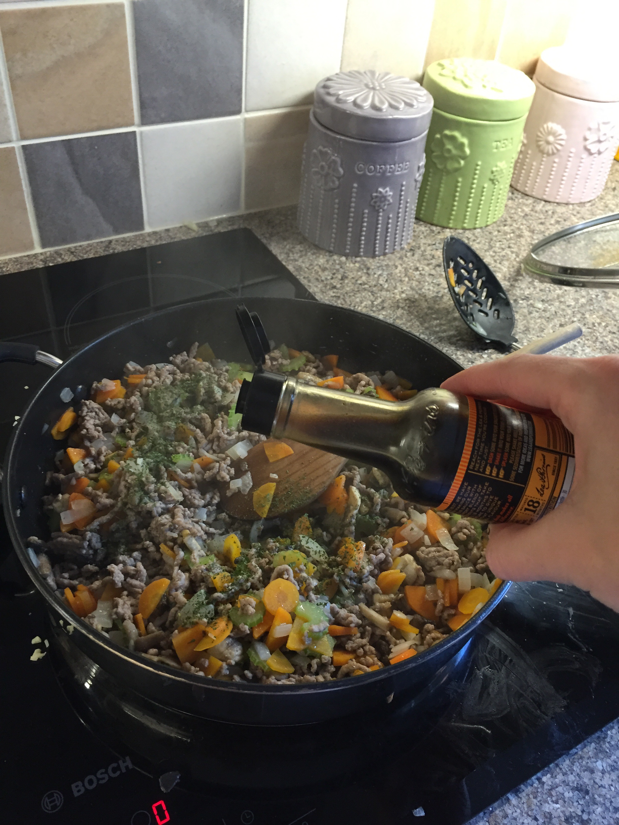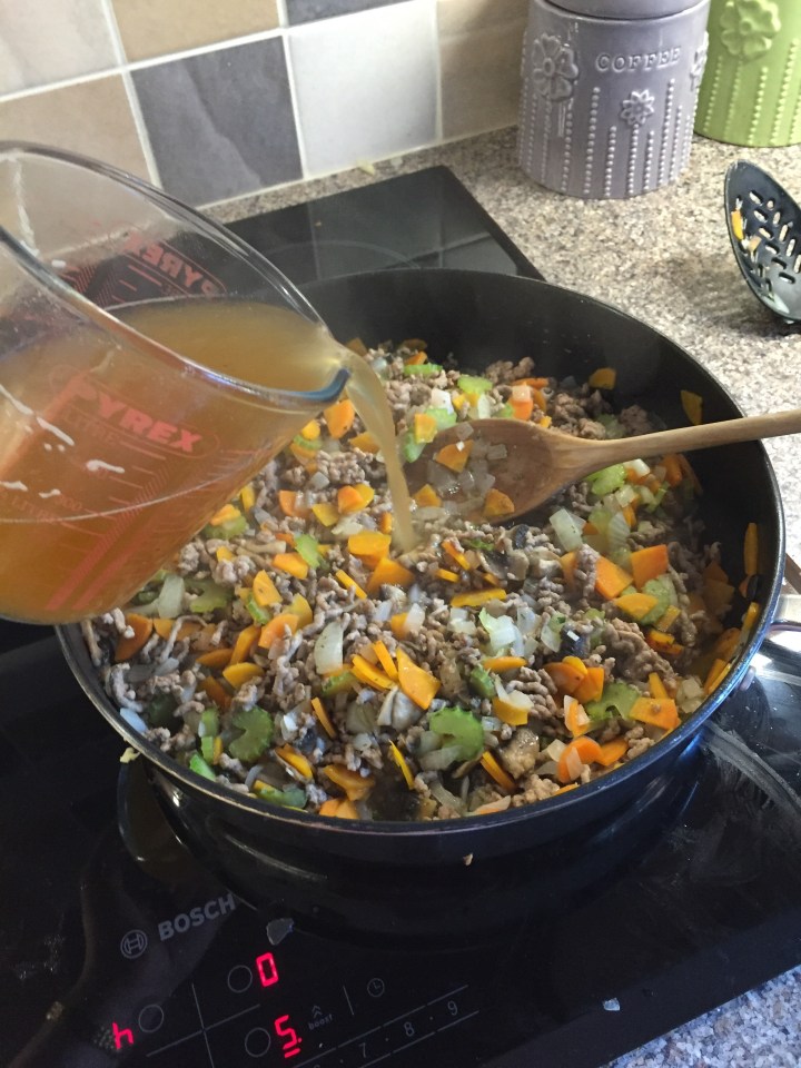 Turn up to high and add the mince. Keep breaking it up as it cooks so it doesn’t clump together. Once it’s browned all over use a pan lid or large spoon to drain the excess oil away. Now’s a good time to boil the kettle to make your stock.