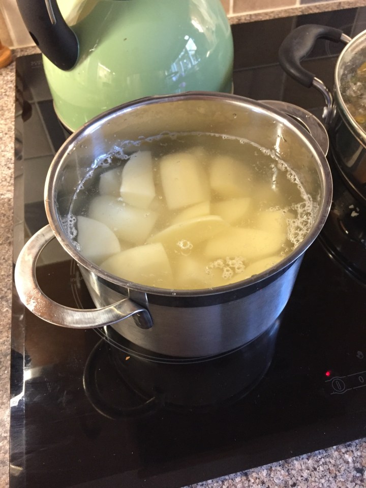 Peel, chop and boil your potatoes. How many you use is really down to how thick a layer of potato you like!