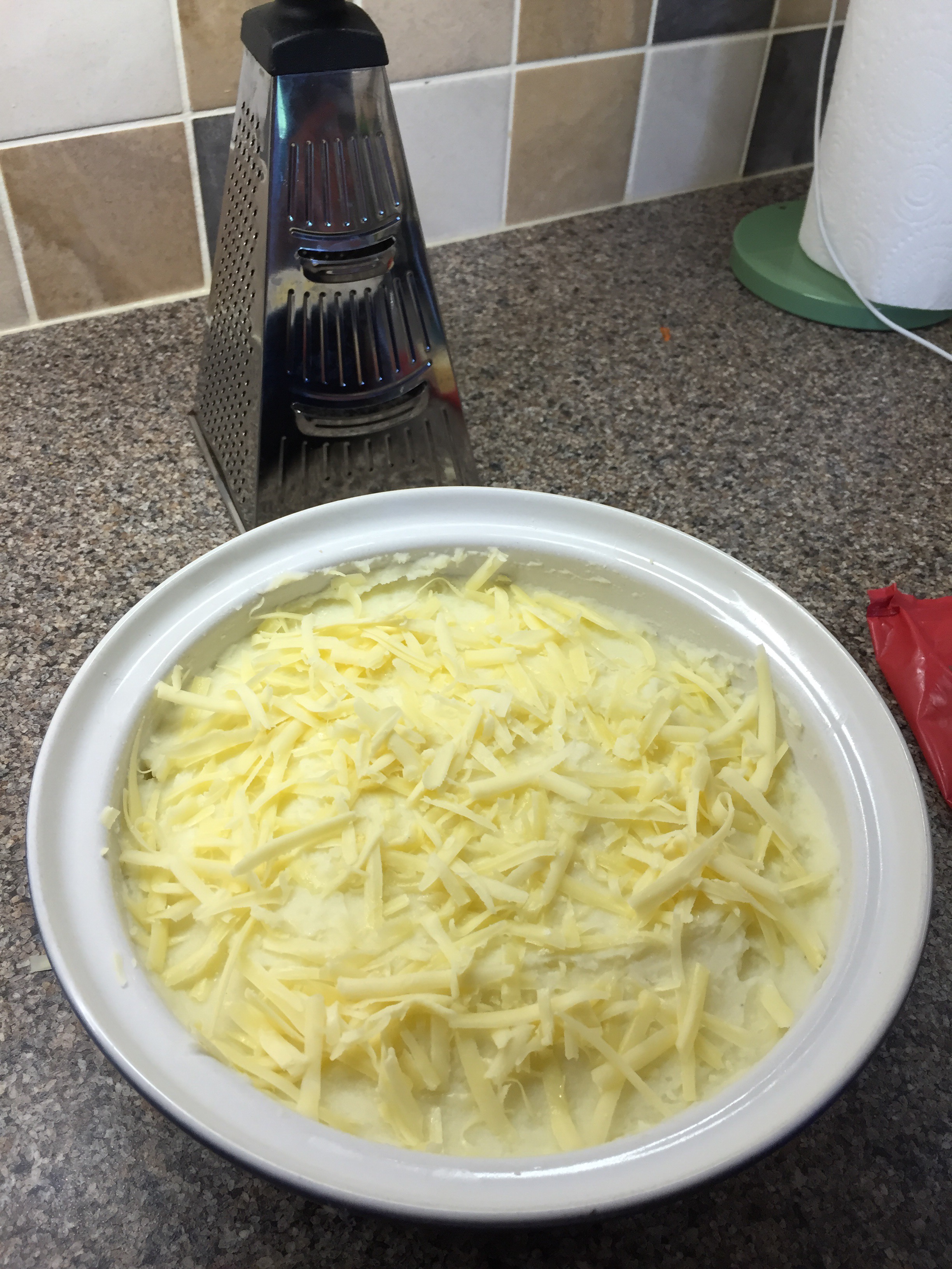 Spoon the potato on top and add some grated cheese- cheddar or similar. At this point you can either put it in the oven straight away or you can freeze or chill it until ready to cook. I made mine the day before and left it in the fridge overnight.