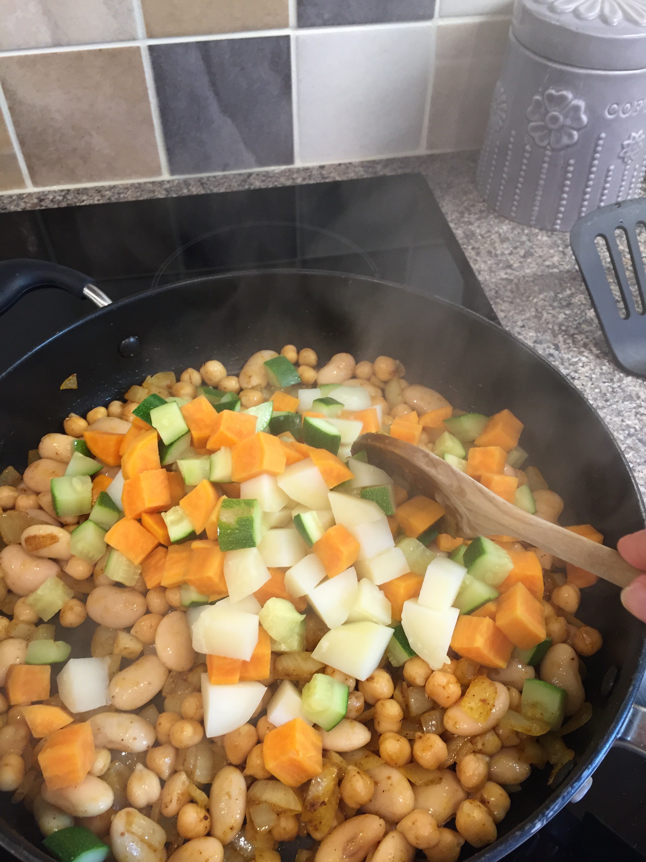 Add the chickpeas (half the tin) and butter beans (half the tin) and fry for a minute