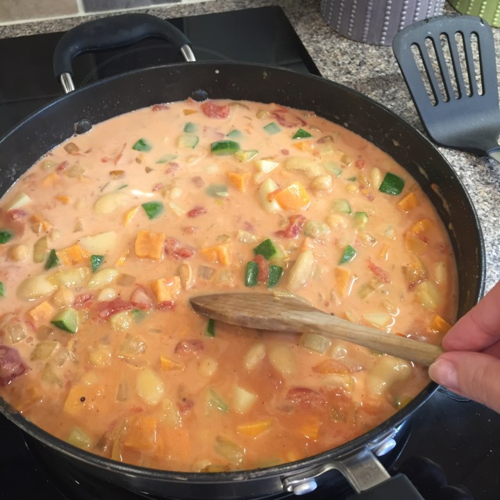Add the tinned tomatoes and tin of coconut milk. If I did this combination again I’d probably only use half a tin of coconut oil and top with a touch of water so it didn’t go too sweet.