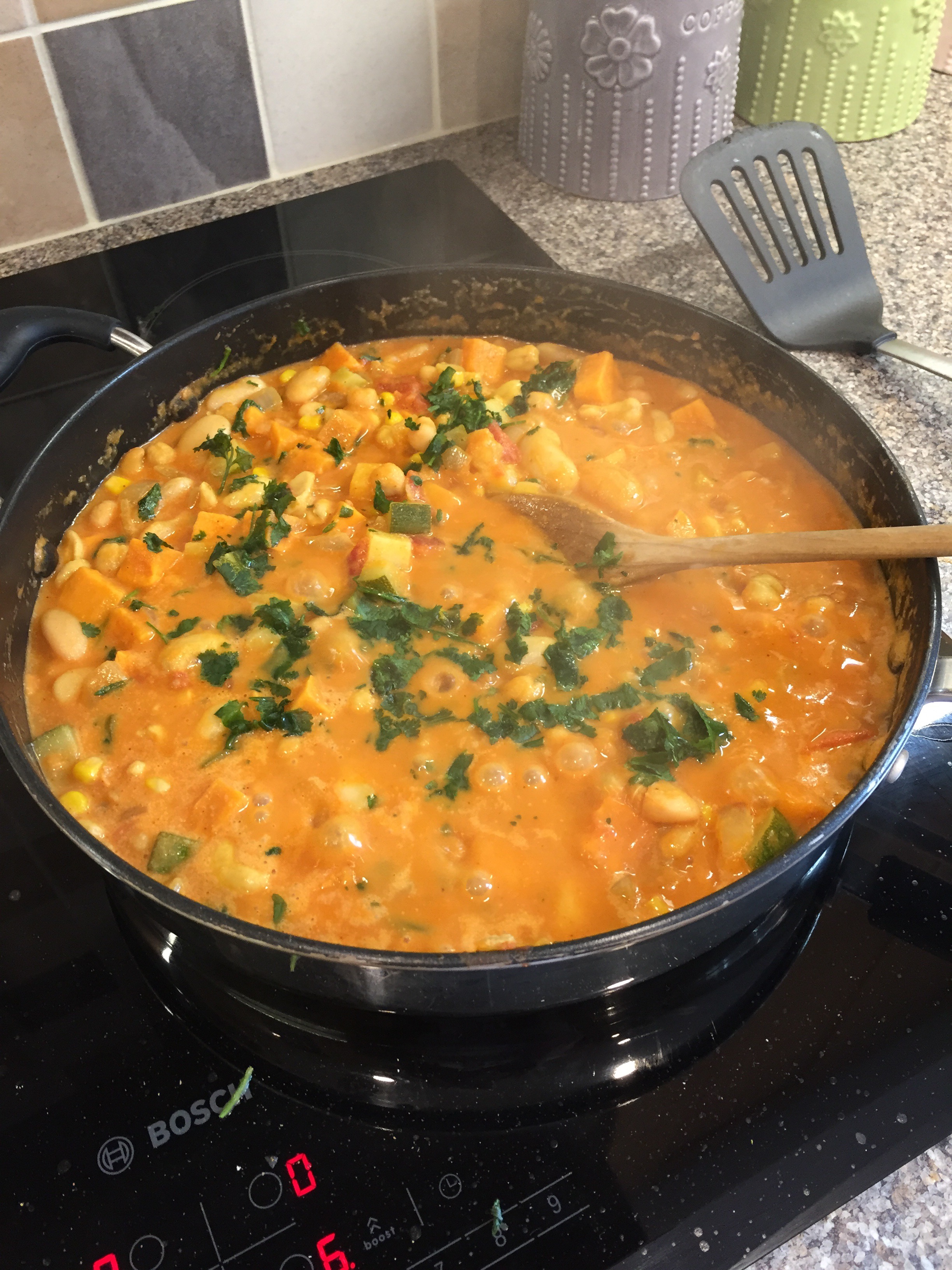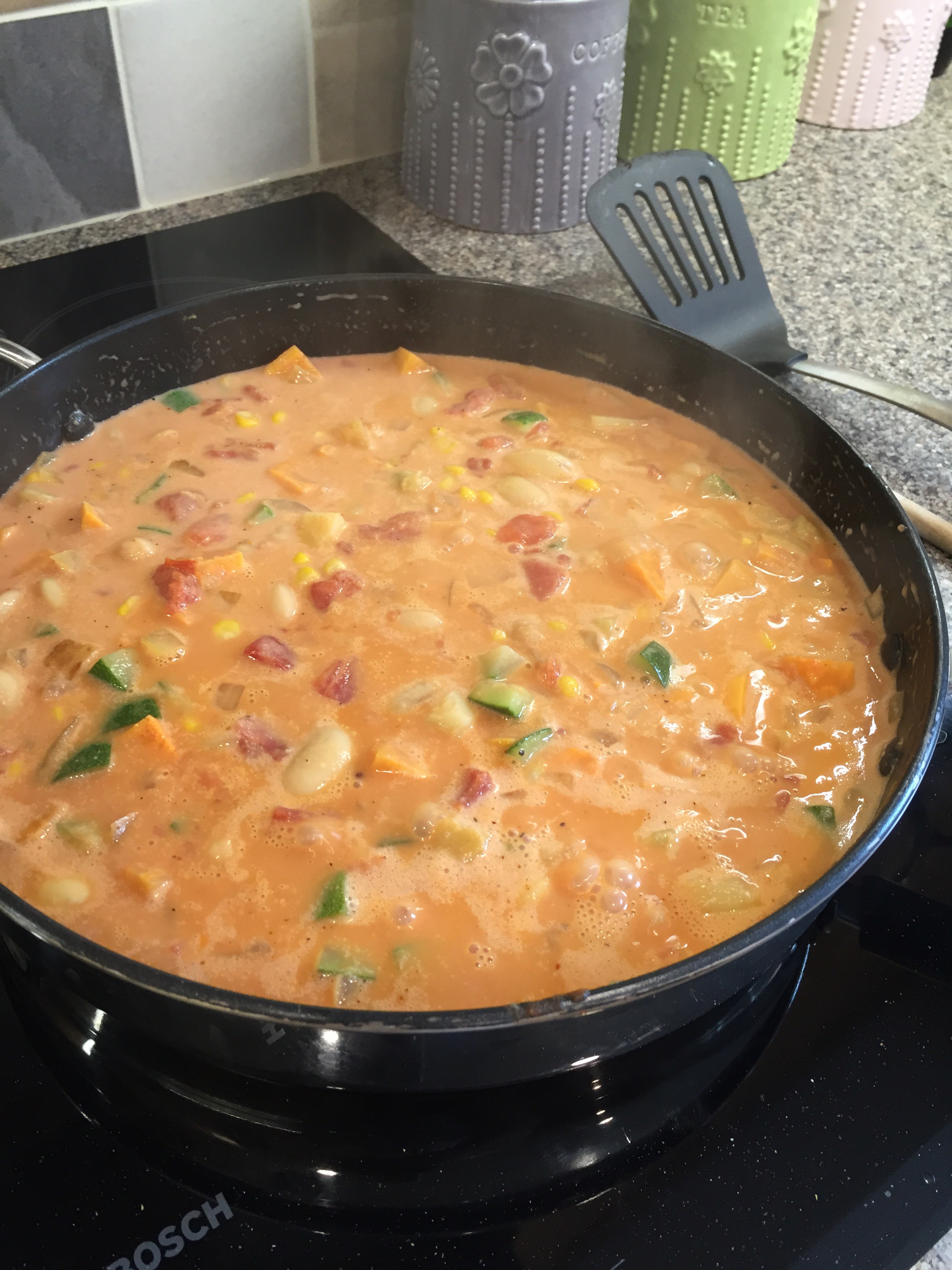 Finally throw in the sweetcorn (half a tin), some salt and pepper and bring to the boil. Reduce to a simmer then leave it simmering for around 15-20mins to reduce down.