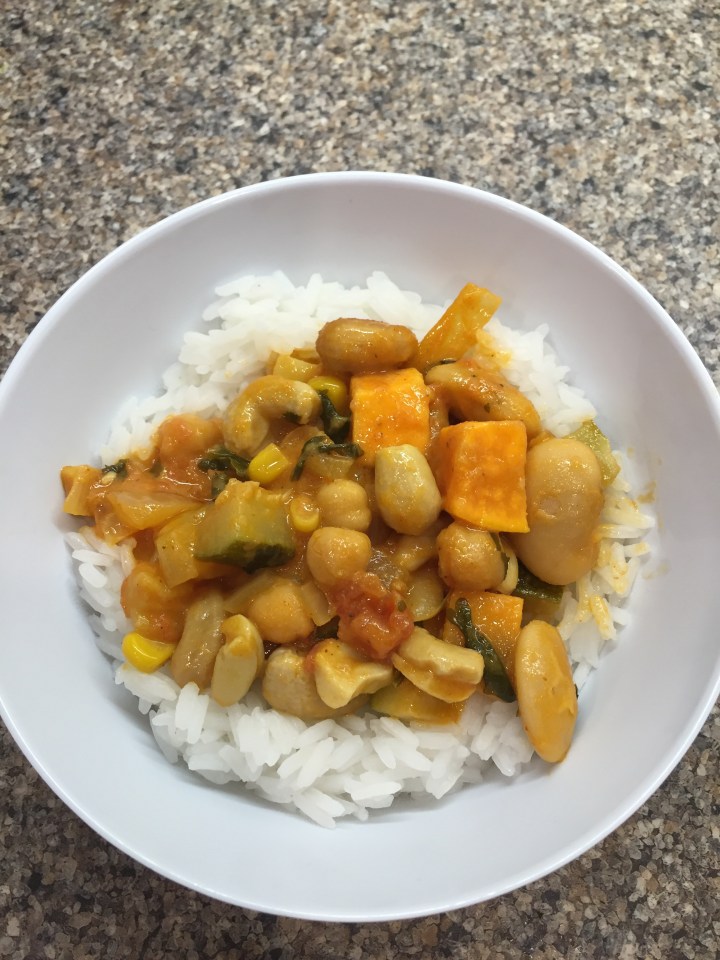 I always keep certain things in my store cupboard as I’m sure you do too- so when I’ve not had a chance to get to the supermarket I can delve in and create something unique from whatever I’ve got in! This day I opted for a curry which turned out great (to my tastes anyway- hubby wasn’t impressed by the lack of meat in it!!)