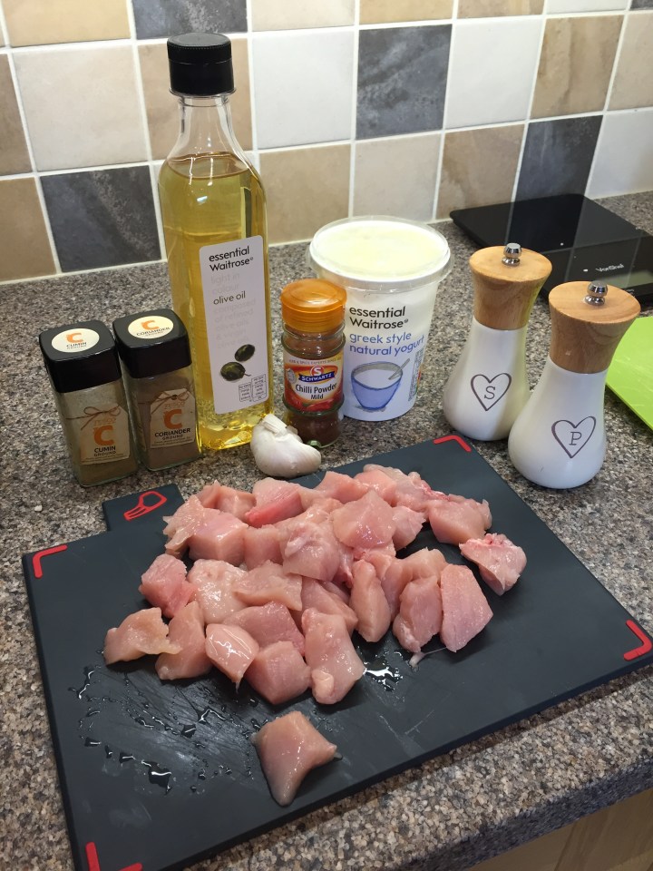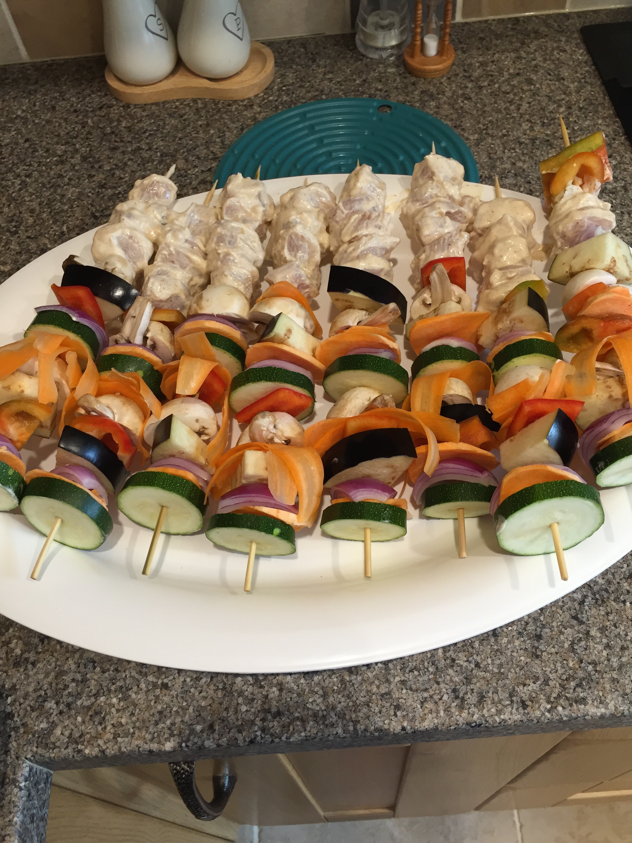 Assemble the kebabs. If you’re using wooden skewers, like I am, soak them in water first to reduce how much they’ll burn when you cook them