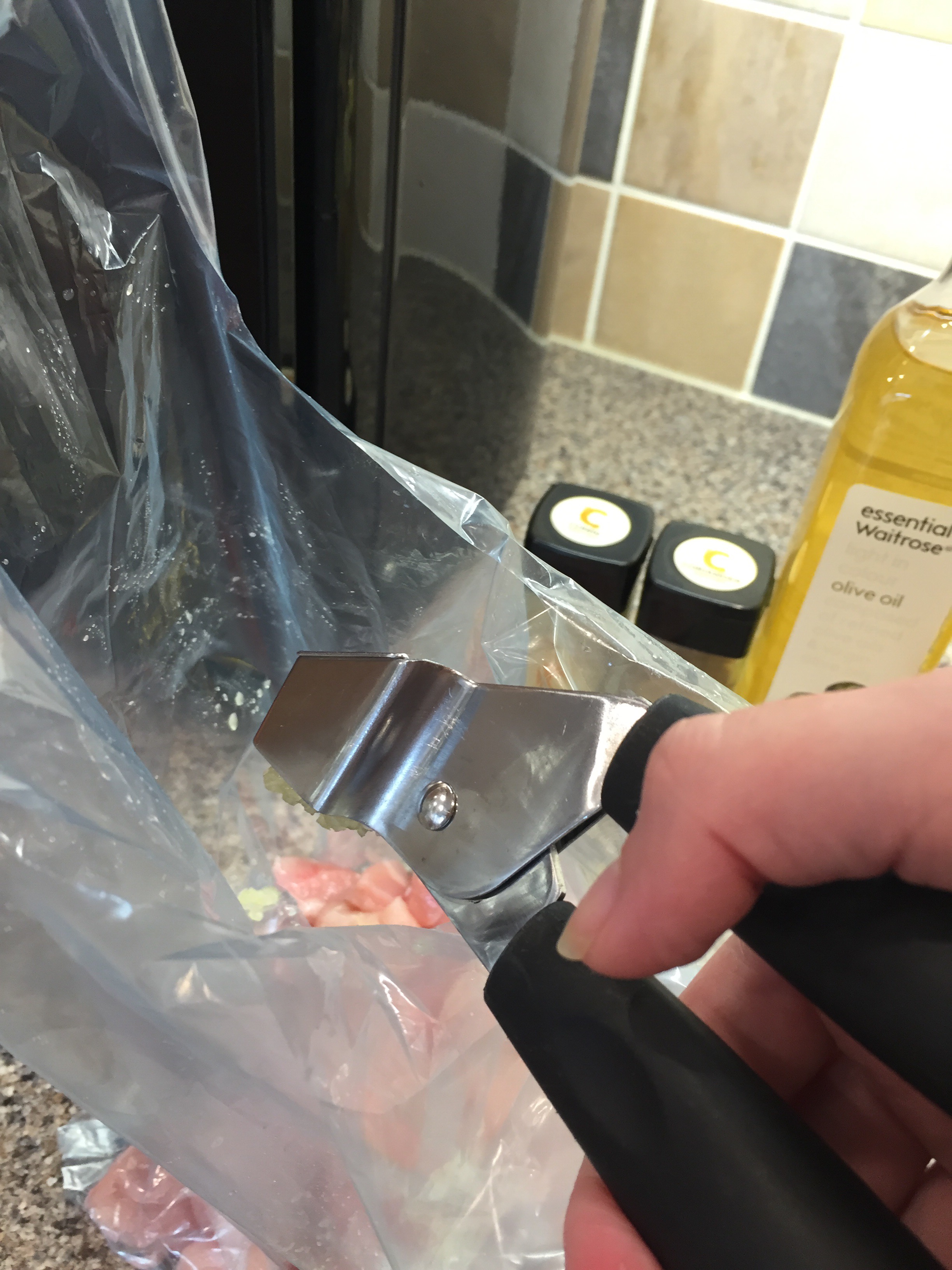 Using a garlic press put 2-3 cloves of garlic into the bag