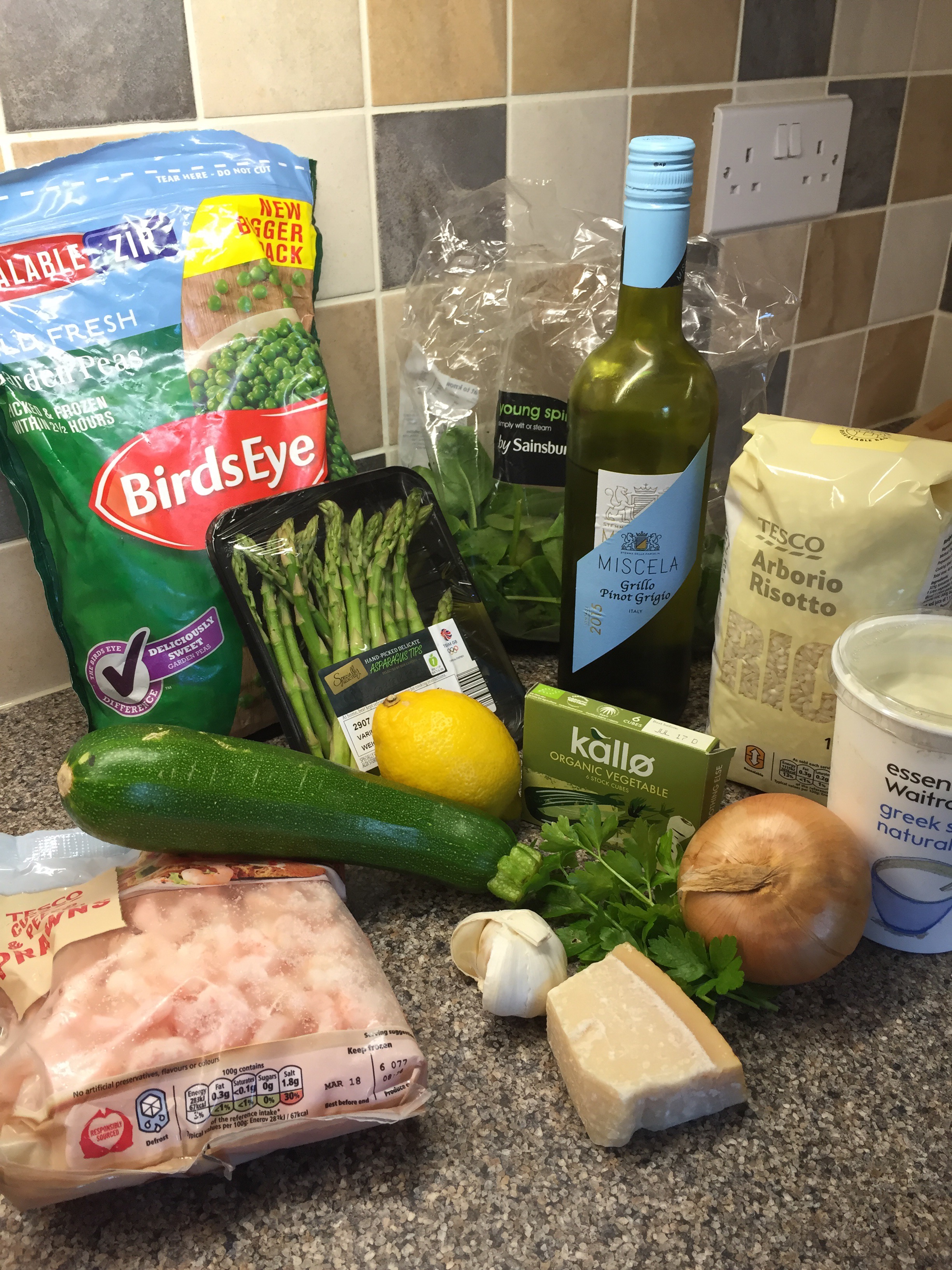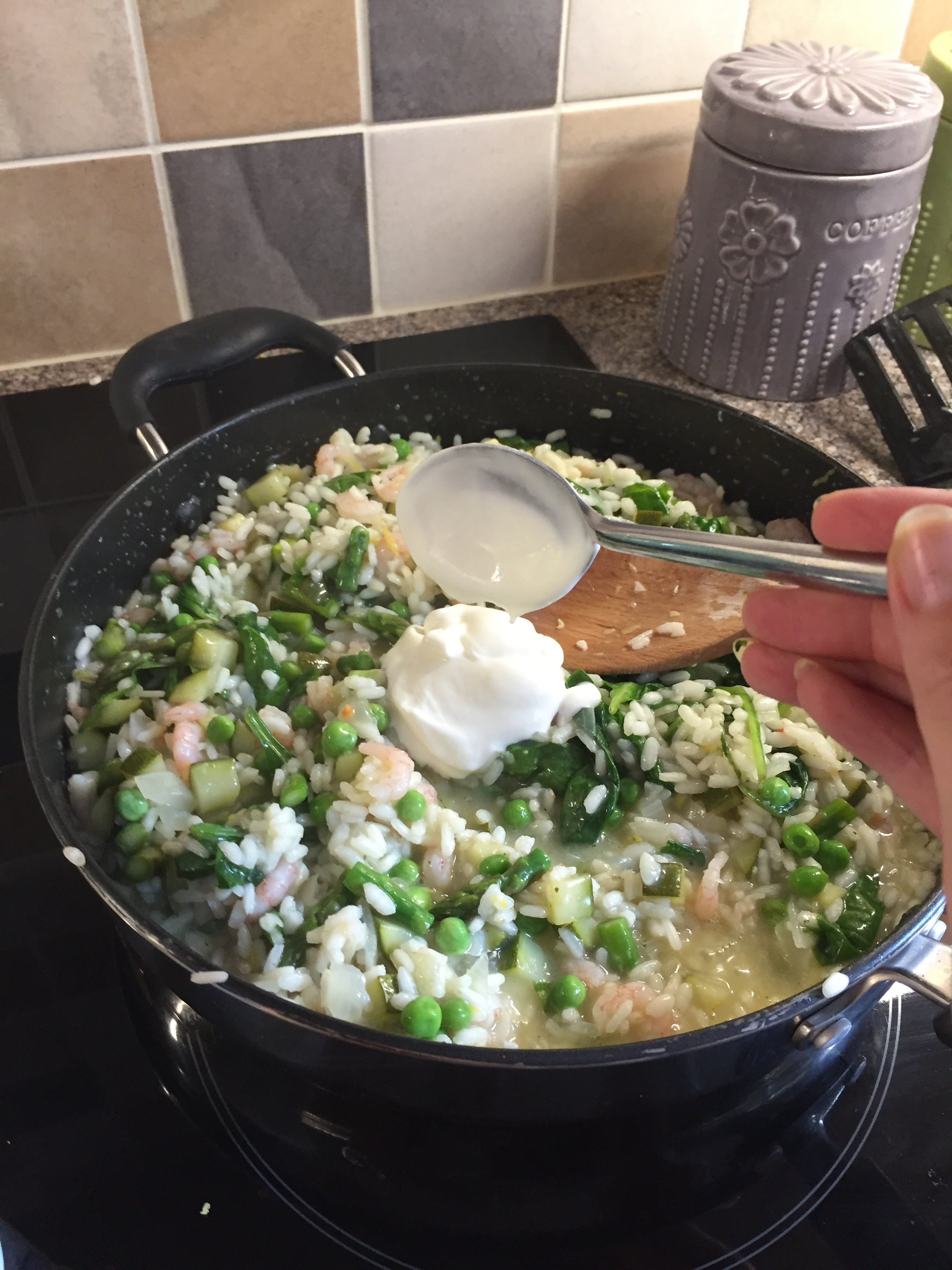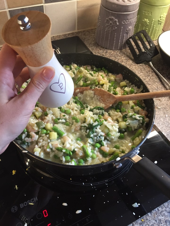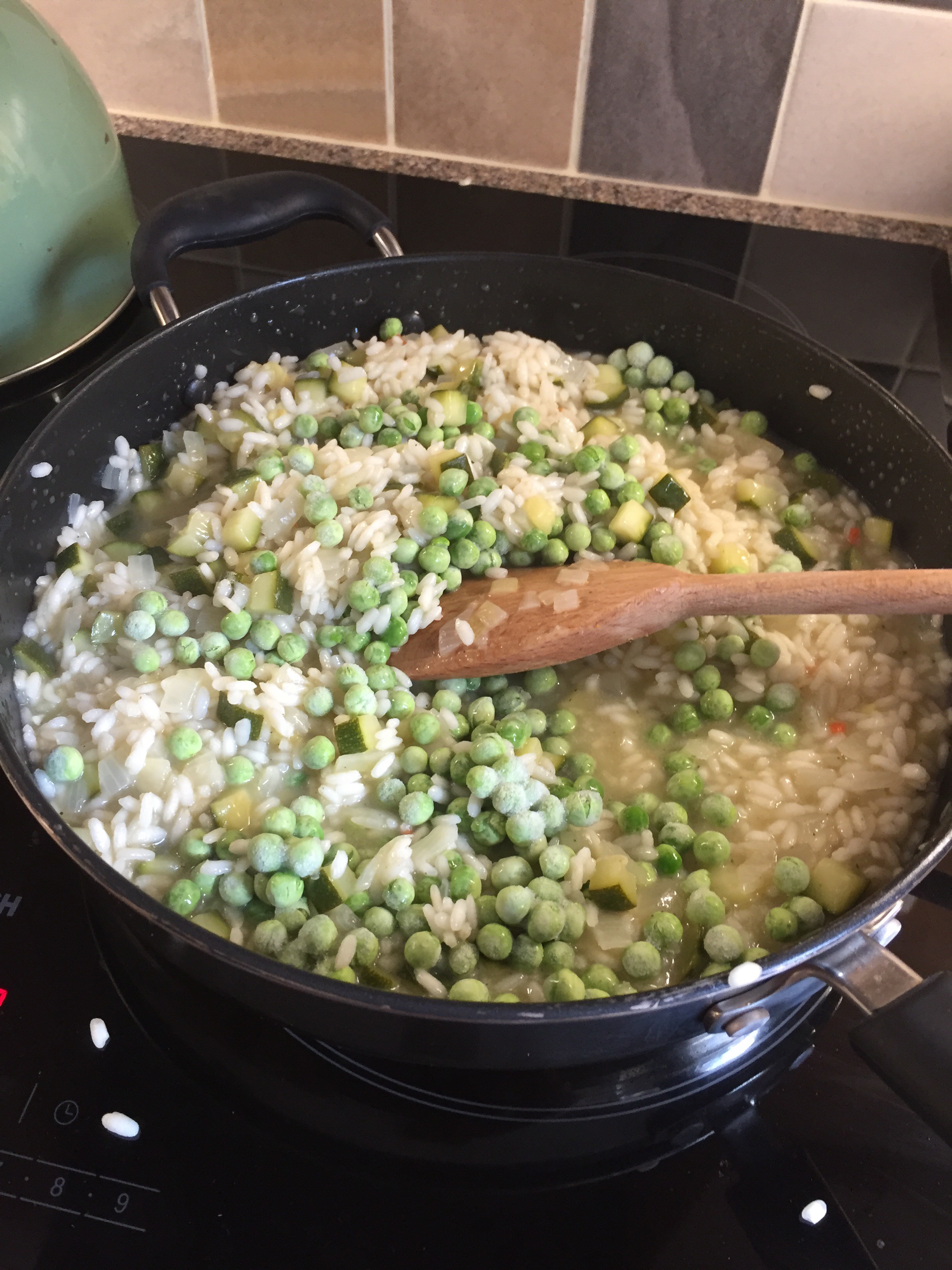 Once you’ve added nearly 1.5pints of stock throw in 4 handfuls of frozen peas and stir in.