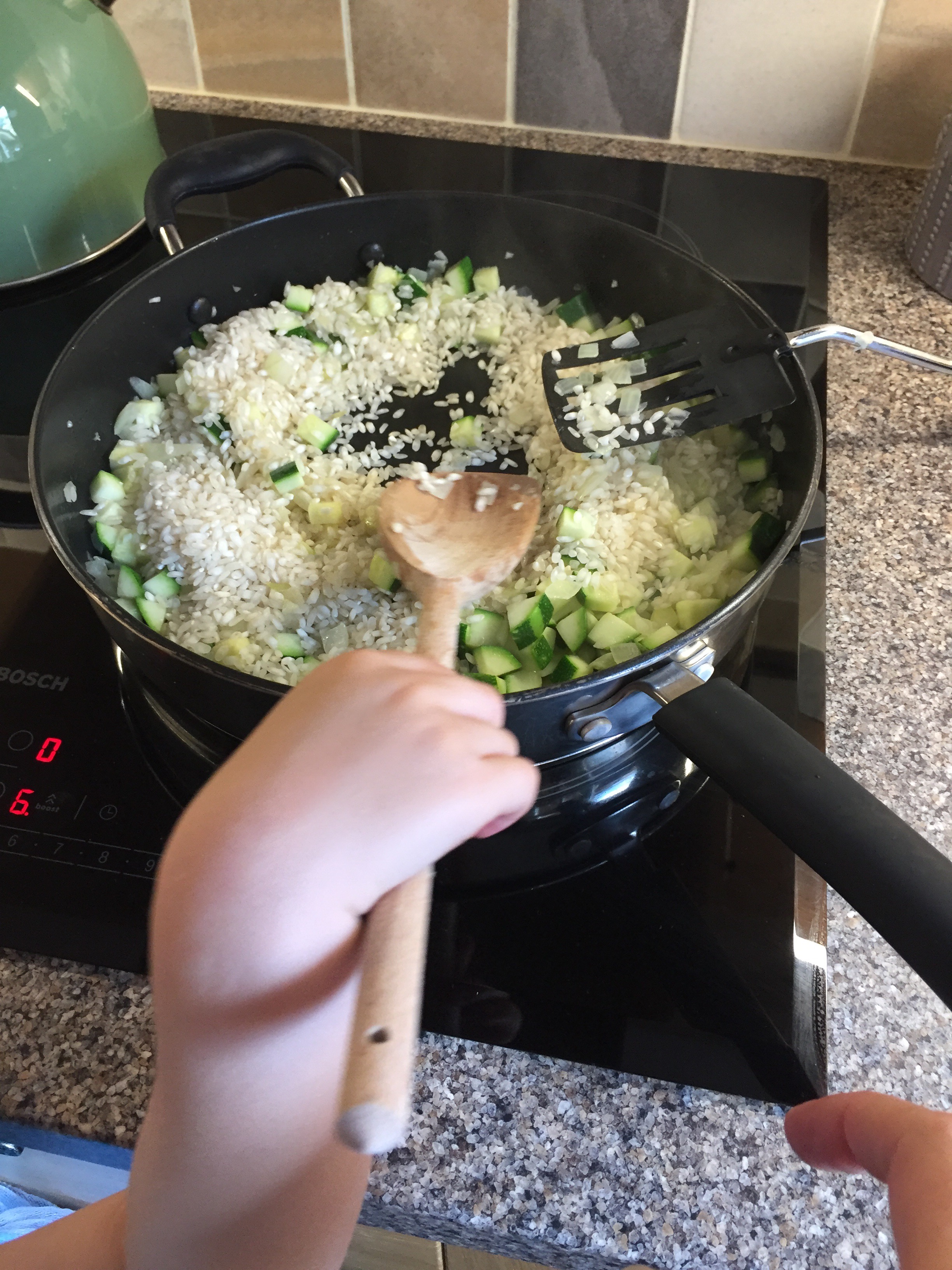 Time to add the stock- a ladle full at a time (around a small glass worth) then stir until it’s absorbed before adding another ladle full. Keep stirring constantly as this brings out the natural creaminess of the rice. If you have a keen kitchen helper it’s good to get them stirring with you!