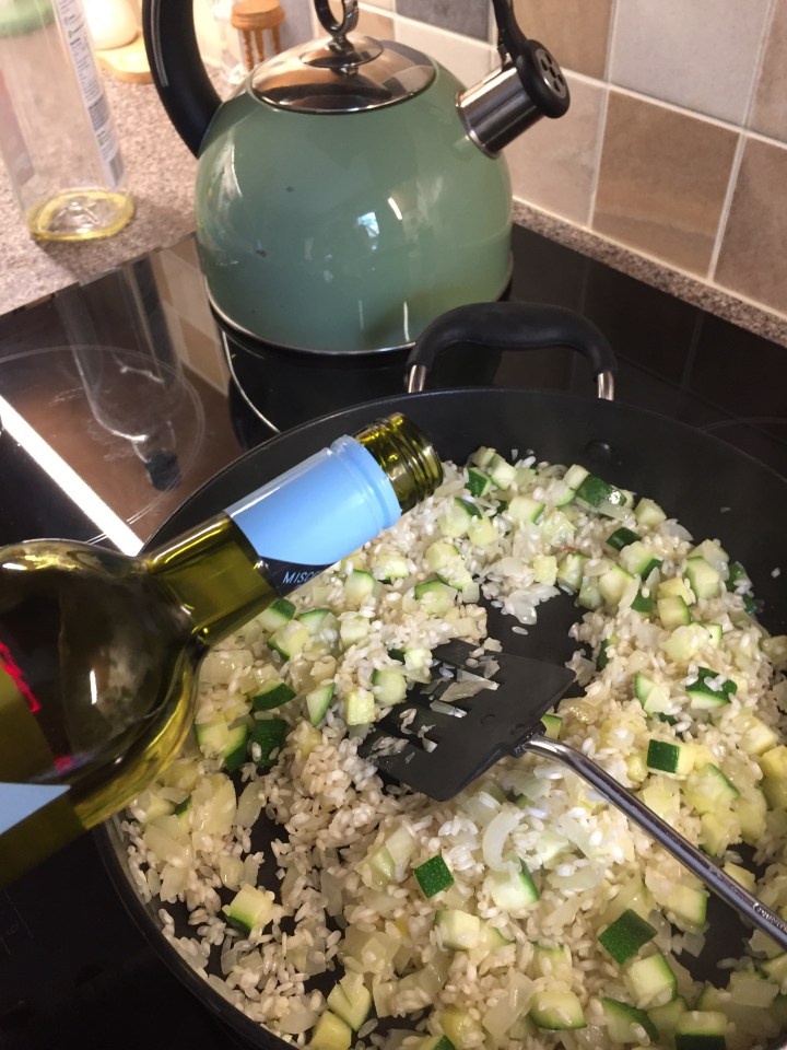 Pour around a small glass of white wine and stir until it’s all absorbed by the rice.