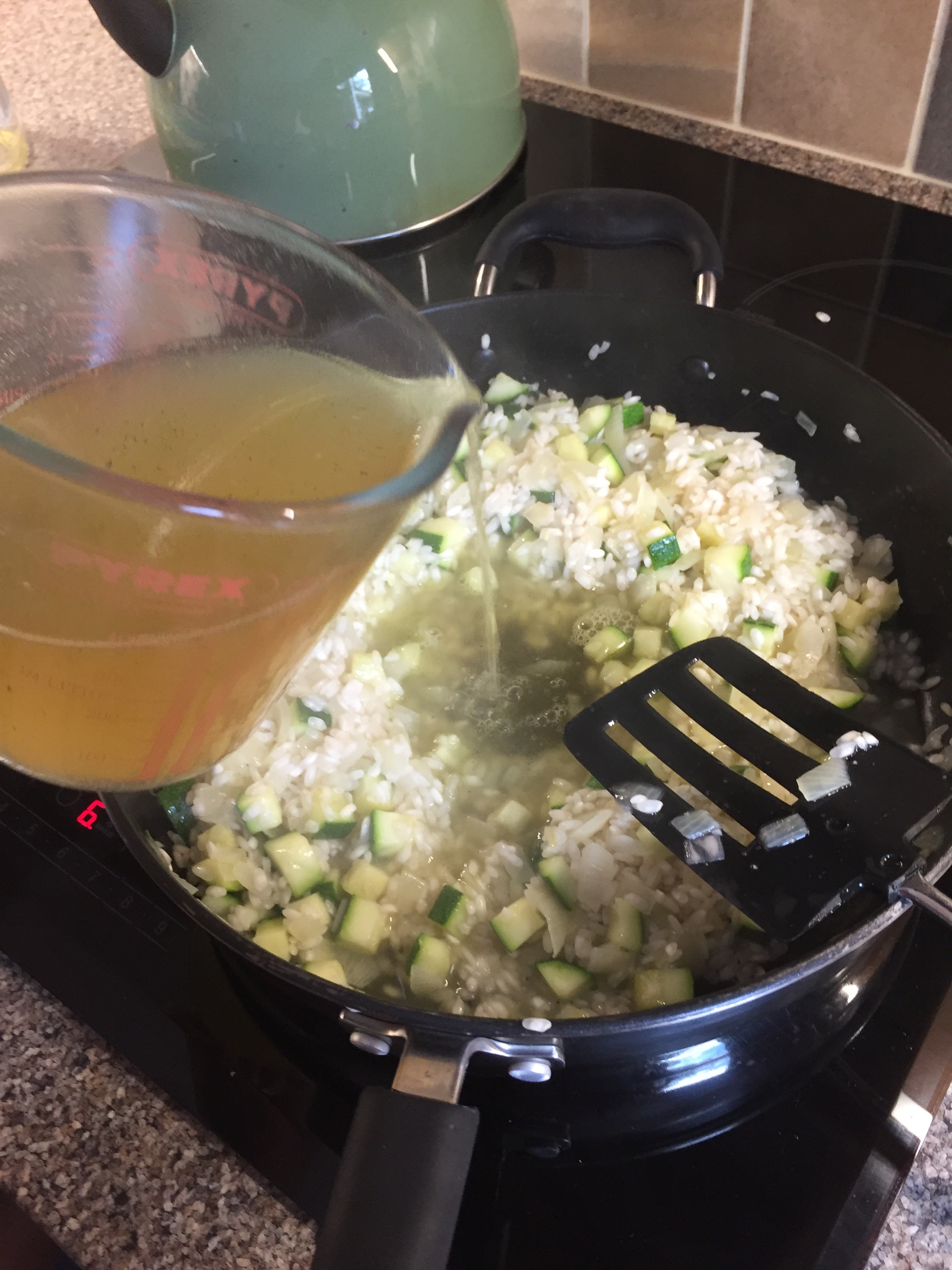 Add the risotto rice and stir to make sure it all gets coated with oil. Cook for another minute. (Toddler came to help with the stirring at this point!)