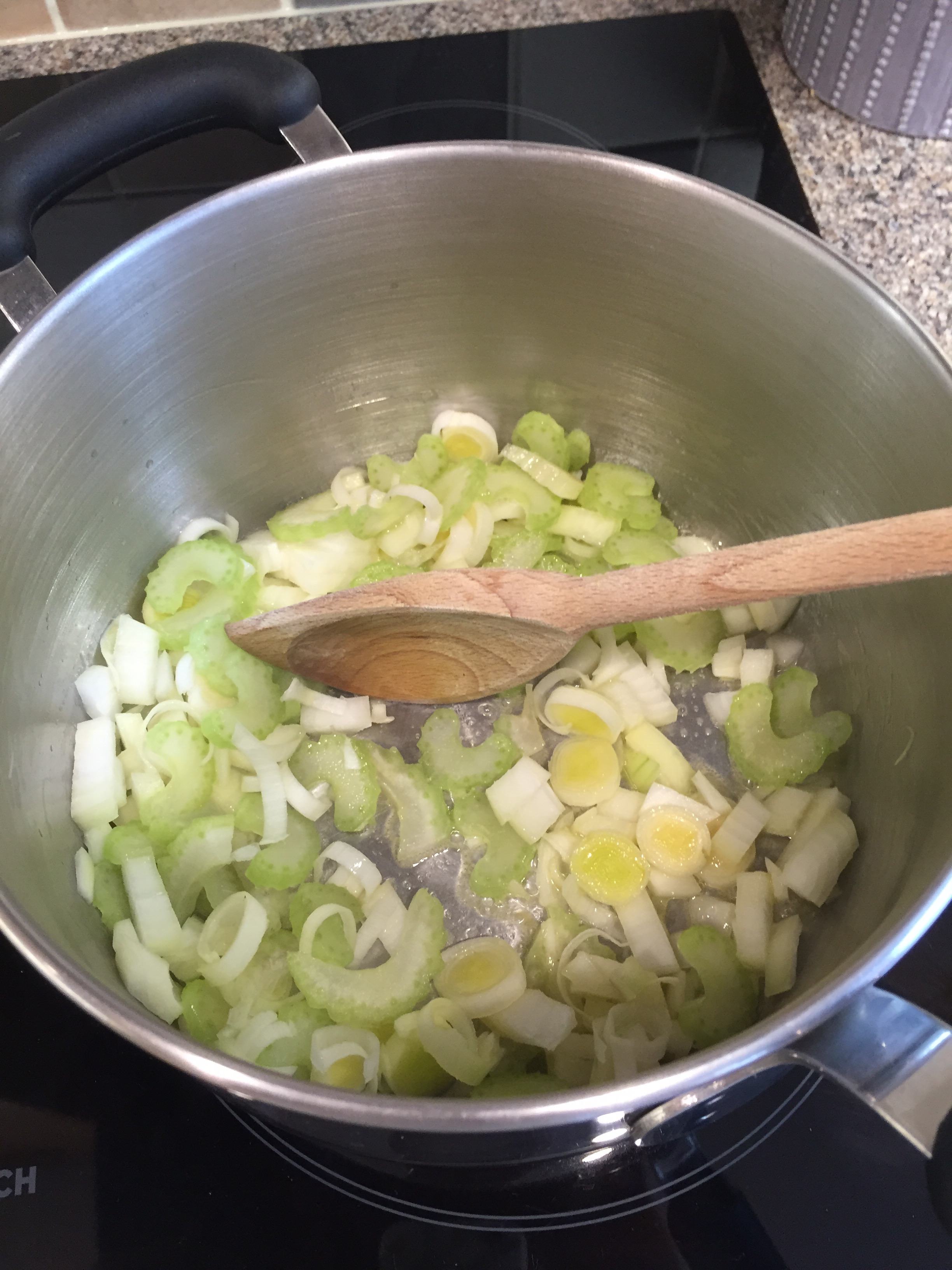 Cook the onion, celery and leek on a low heat for 5-10mins to soften