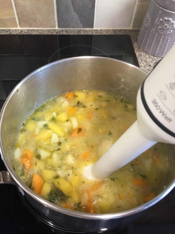 Meanwhile- Chop the vegetables relatively small (don’t worry how pretty or even they are as they’ll all get blended later!)