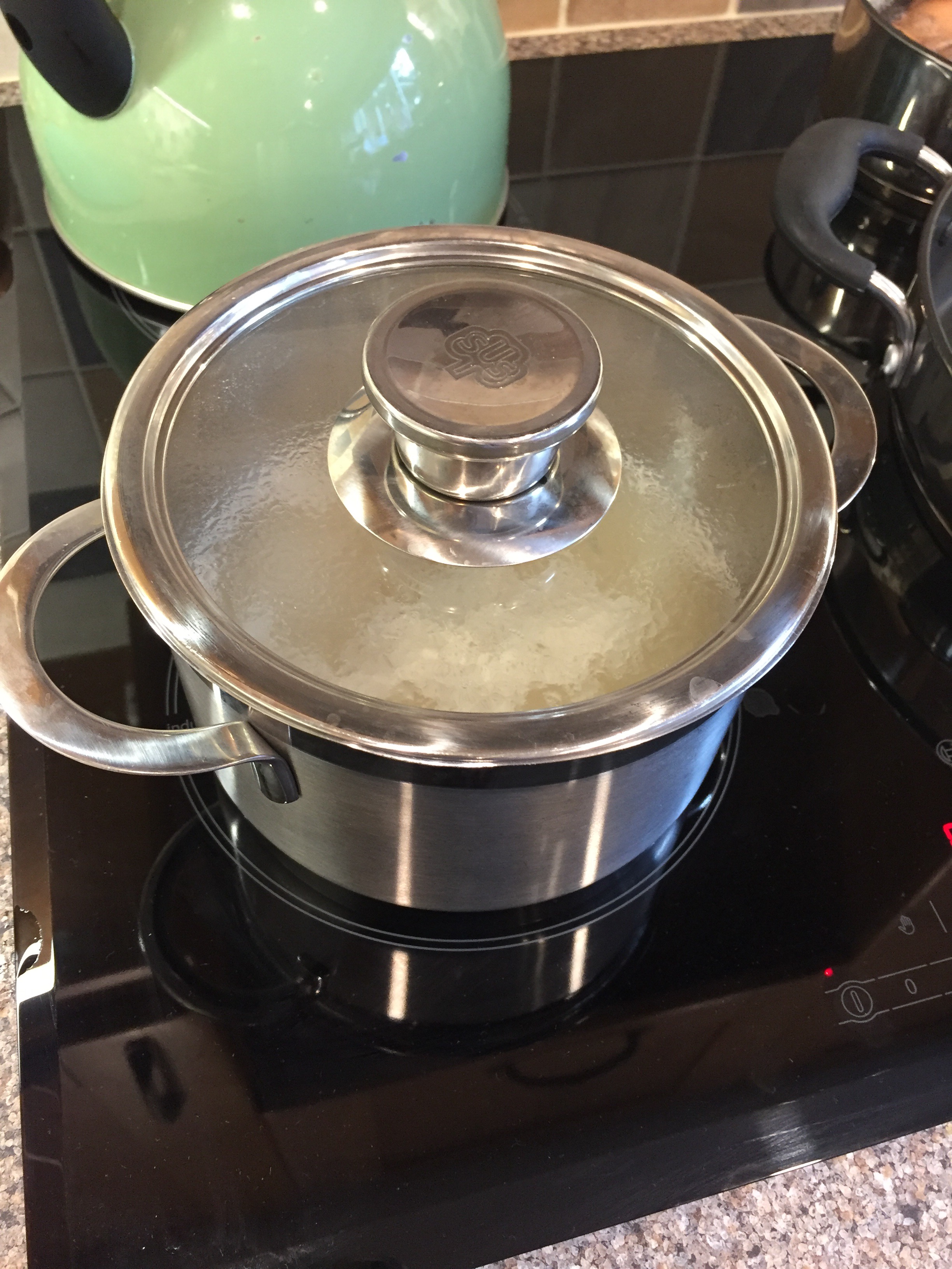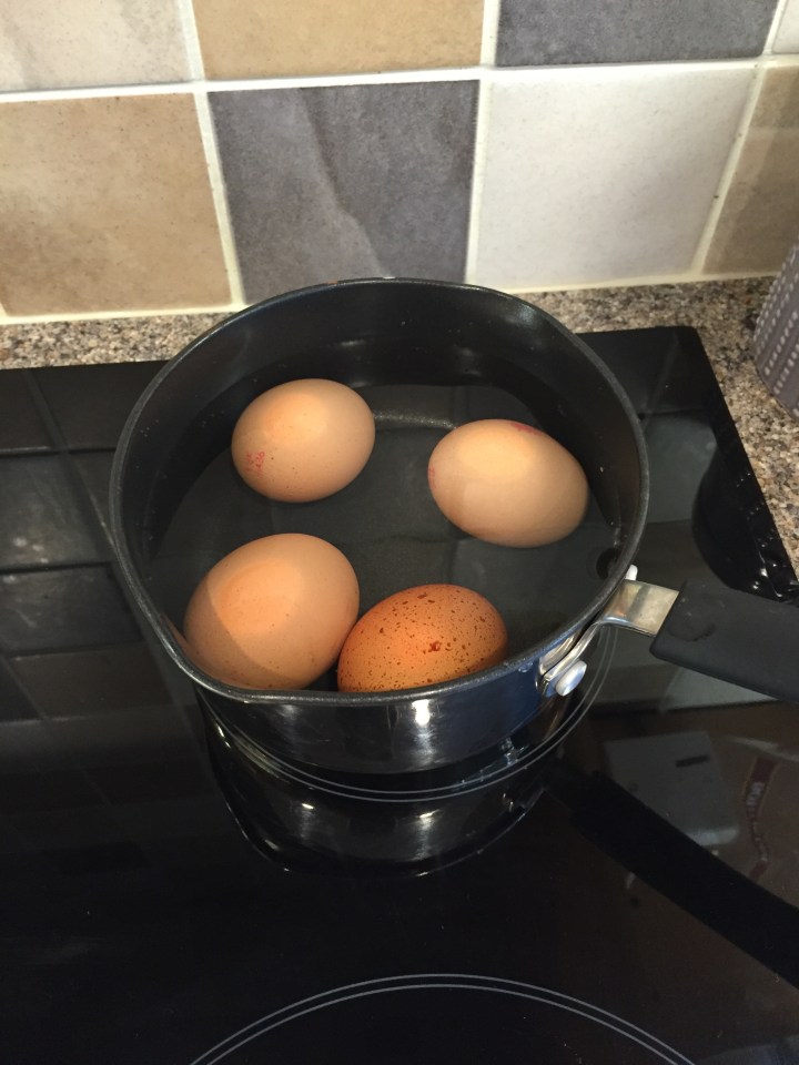 While the rice is cooking put the eggs in a pan of boiling water and simmer for 8-10mins to harden. Once they’re cooked put them into cold water for 5mins before peeling and slicing into quarters.