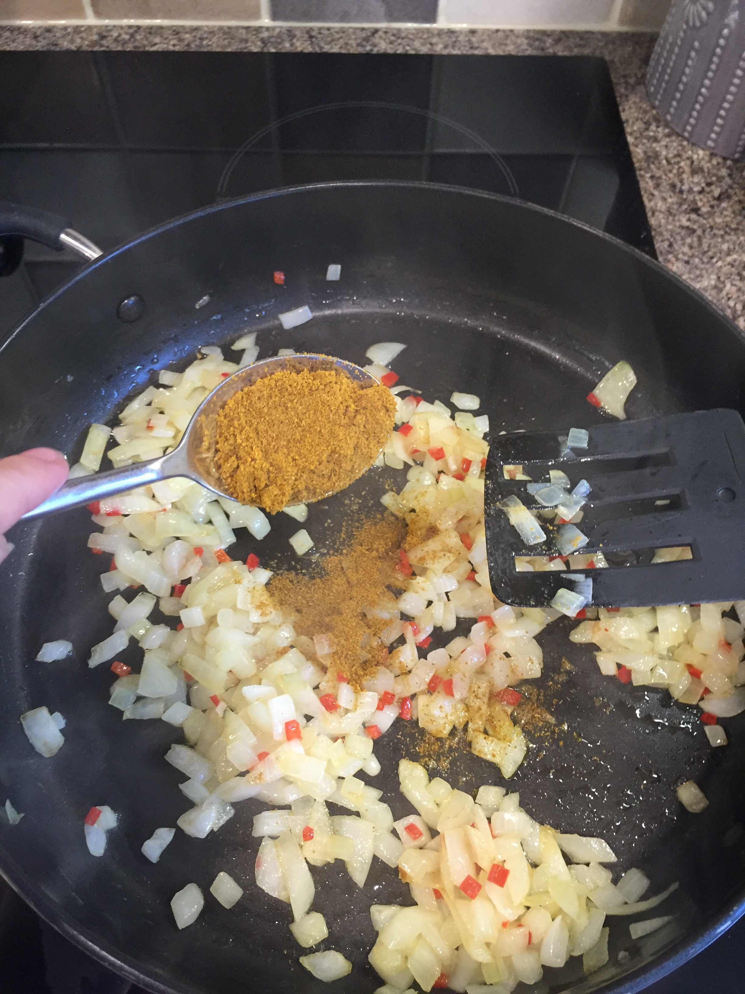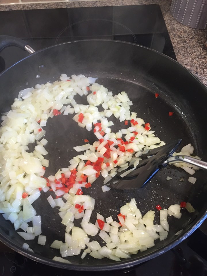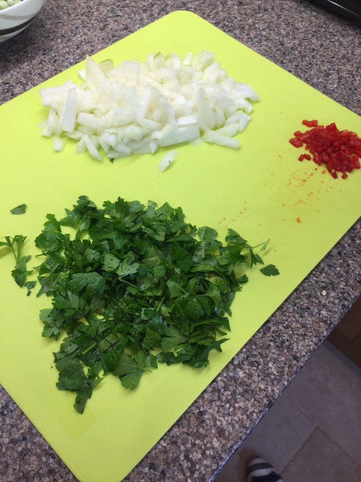 Meanwhile dice the onion, finely chop the chilli and roughly chop the parsley