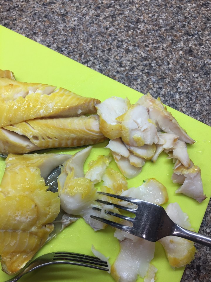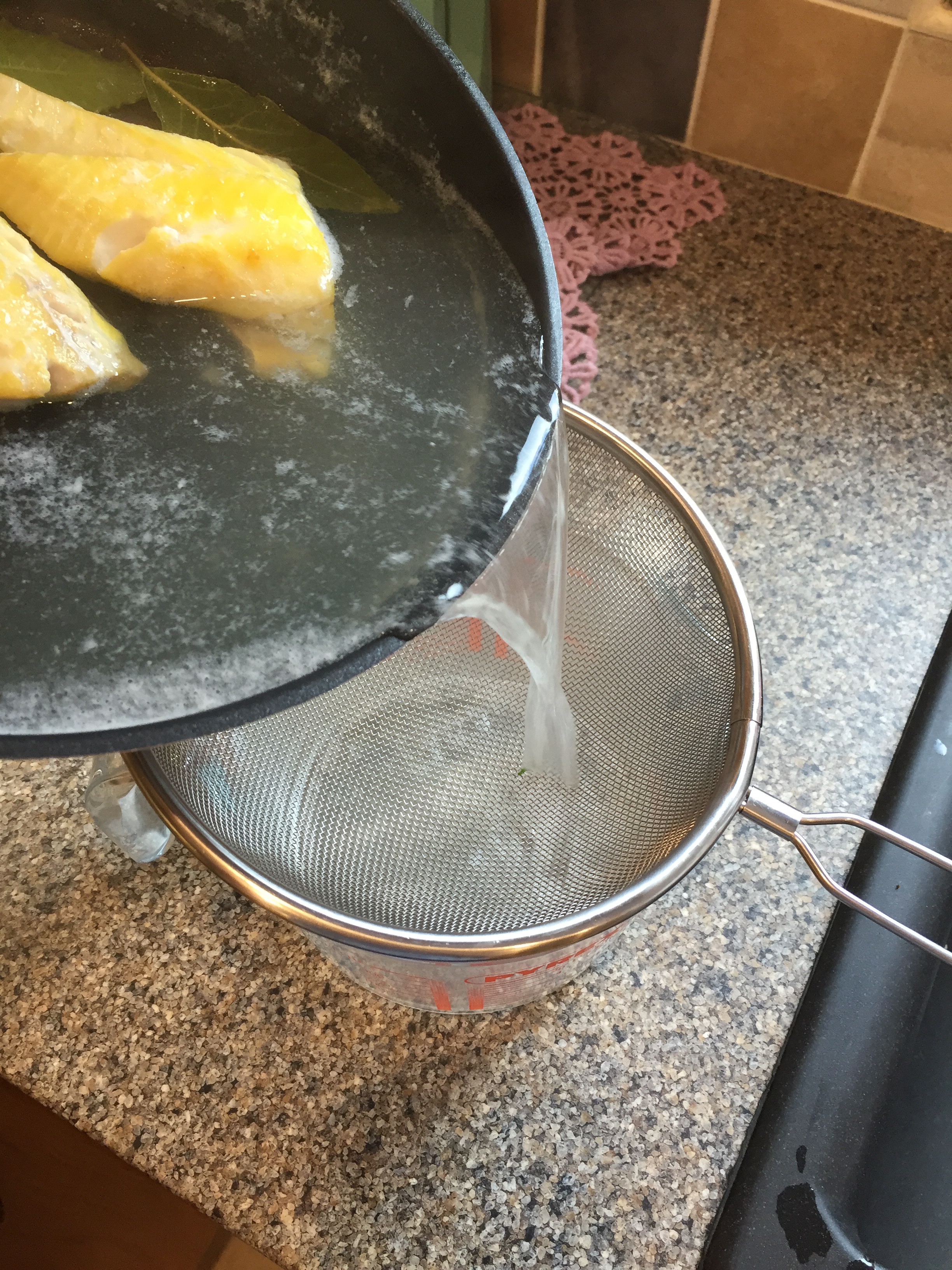 Once the fish is cooked drain the liquid into a jug and throw away the bay leaves
