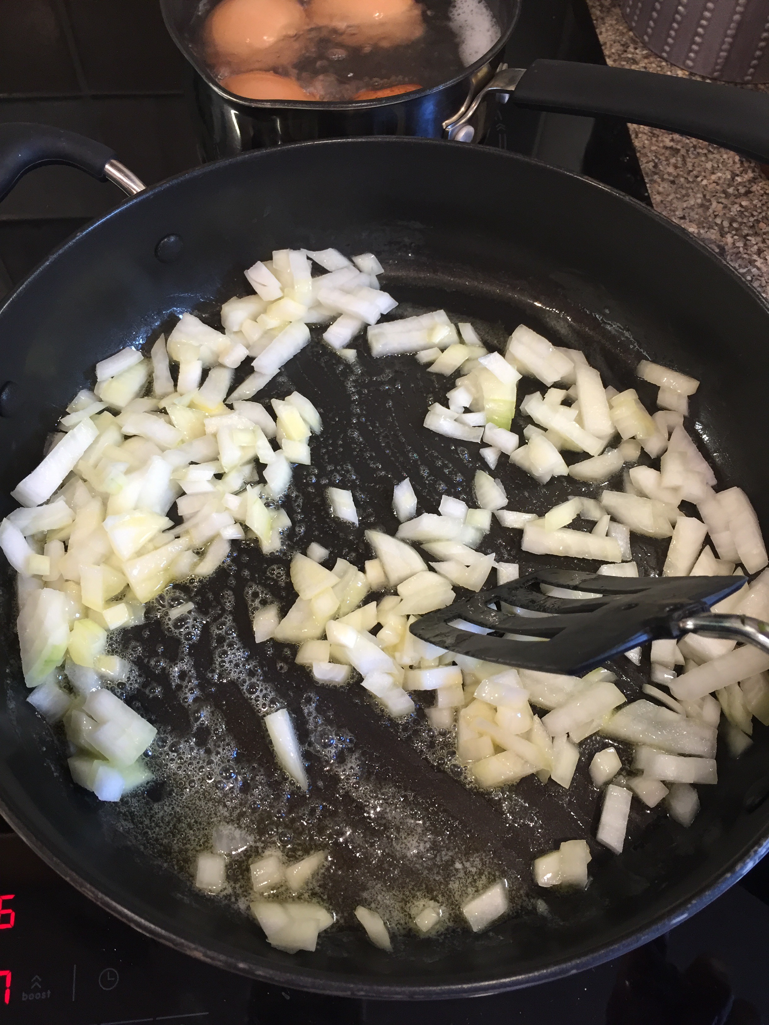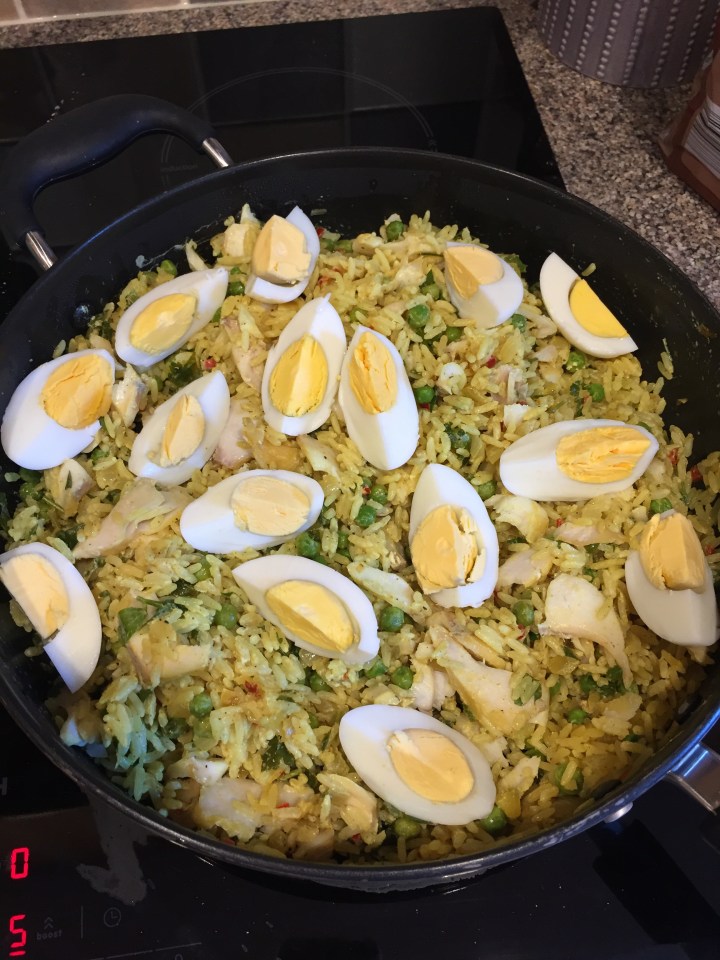 And finally the eggs. Put the lid on the pan and cook everything through for 4mins before serving!