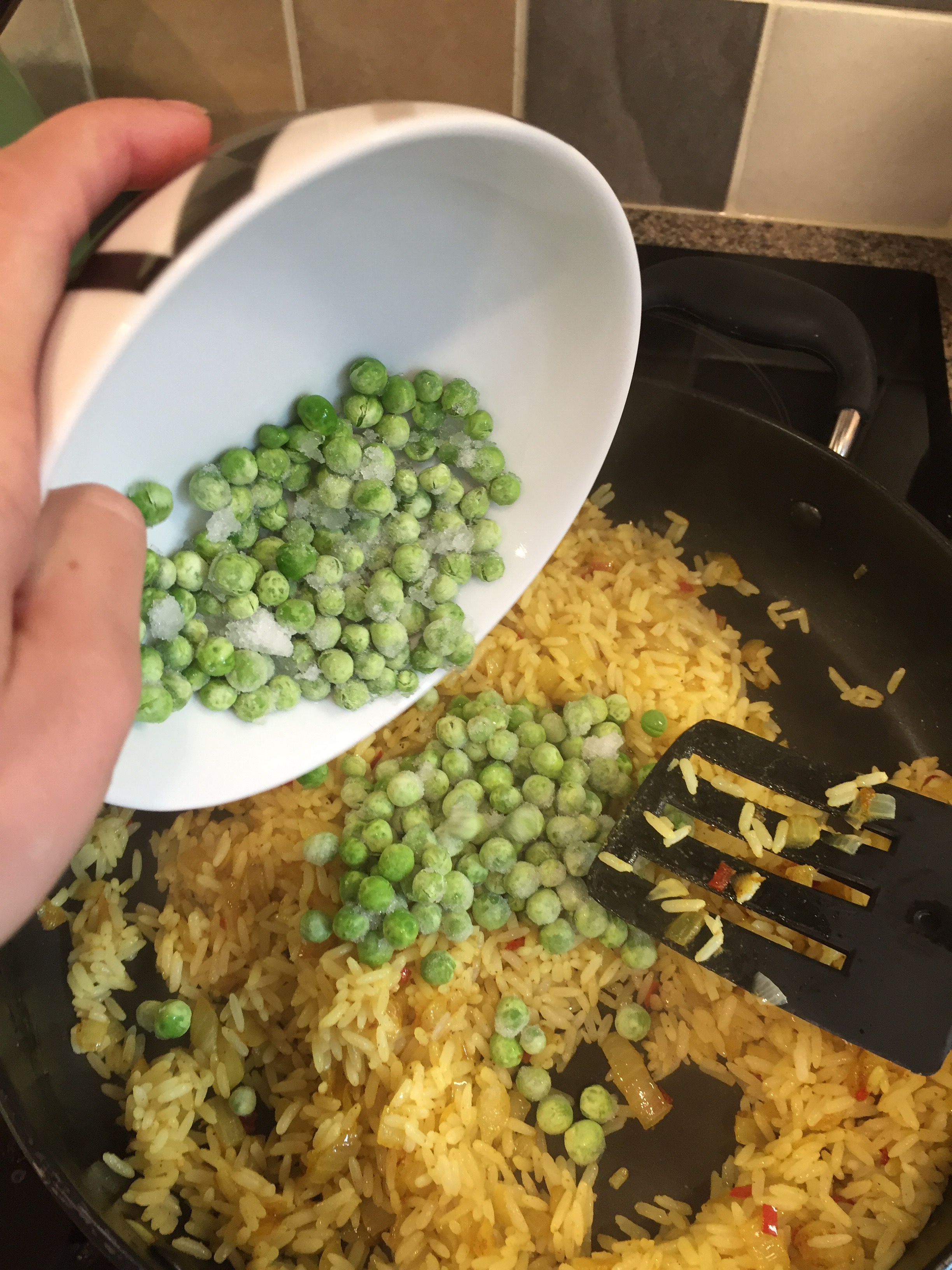 Add the cooked rice and the peas to the pan and stir until the rice is coated